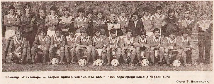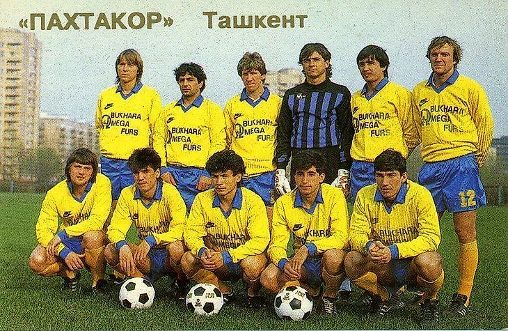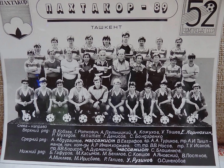 Ленинград. 7 апреля 1990 года. СКК им. В.И. Ленина. Первая лига. 1 тур. «Зенит» (Ленинград) – «Пахтакор» (Ташкент) – 1:1 (0:0). Команда гостей перед игрой (слева направо): С. Бондаренко, А. Пятницкий, И. Шарипов, Х. Оганесян, И .Шквырин, М. Кабаев, А. Тихонов, О. Тиллаев, М. Белялов, А. Яновский и Г. Денисов