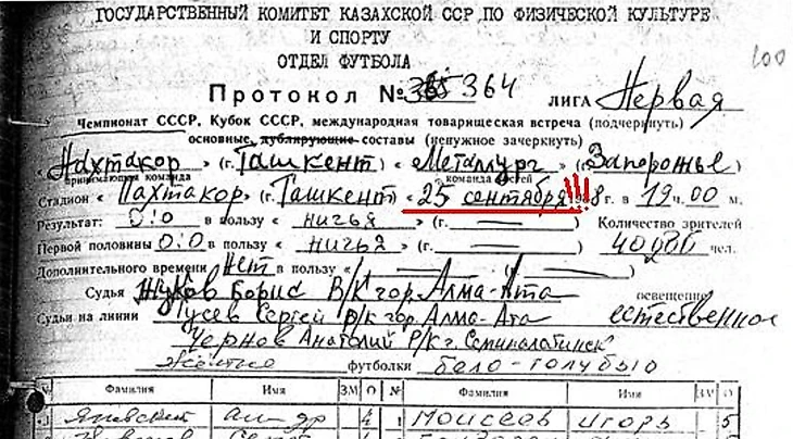 Фрагмент протоколп матча «Пахтакор» – «Металлург» (Запорожье) – 0:0, сыгранного 25 сентября 1988 года, в котором ташкентцы играли в желтых футболках