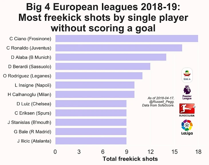 Да, у Криштиану отличная статистика за всю карьеру – 44 гола со штрафных ударов Но с момента последнего удачного штрафного прошло больше года. По количеству подходов без голов его в Серии А превзошел только один игрок – Камило Чиано из «Фрозиноне», но он уже вылетел в Серию Б. Чиано и Криштиану в апреле лидировали в общеевропейском топе худших исполнителей штрафных – кто больше всего бил и ни разу не забил.