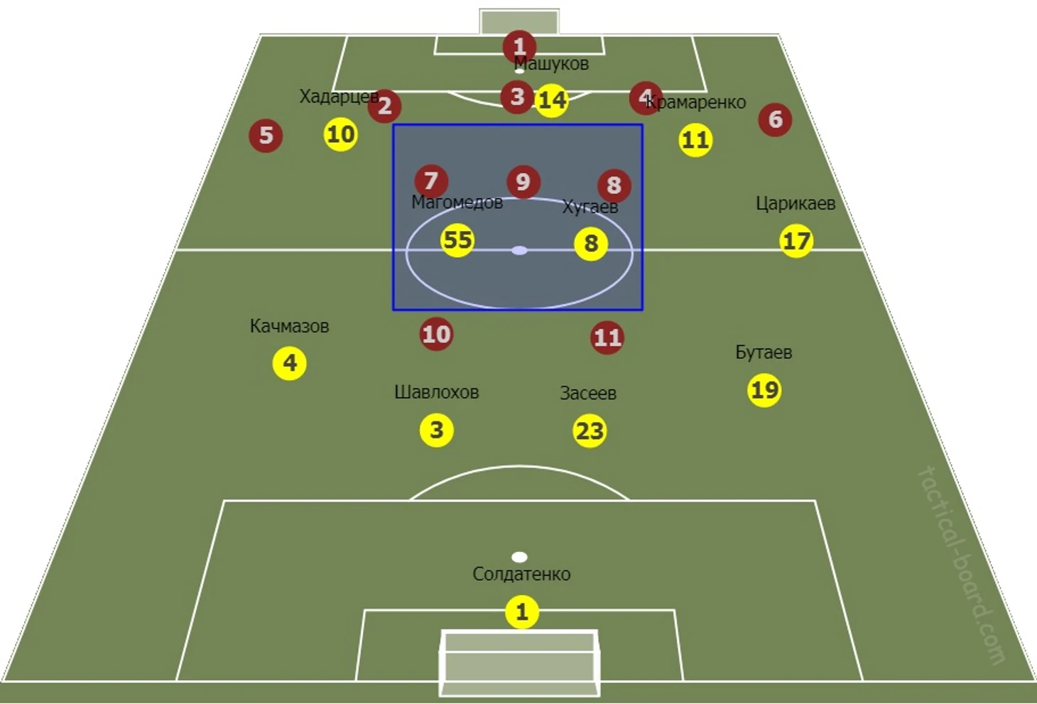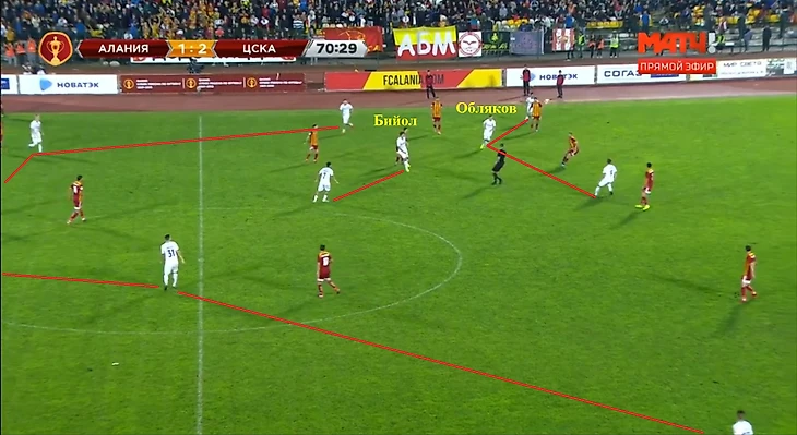 Одинаковые схемы, но принципиально разные действия и роли футболистов. Армейцы при любых фазах игры будь то атака, оборона или переходные фазы играли узко. Бийол-Сигурдссон-Ахметов-Обляков сжимали квадрат со всех сторон таким образом, что в центре поля нашим футболистам не хватало ни времени, ни пространства для обостряющих передач. По этой причине так много подборов за футболистами ЦСКА, так мало передач от Магомедова и Хугаева в атаку. "Алания" наоборот старалась растянуть игроков ЦСКА по ширине поля, создать пространство для Хадарцева и Крамаренко, использовать таранные качества Машукова для того, что бы продавить центр обороны.