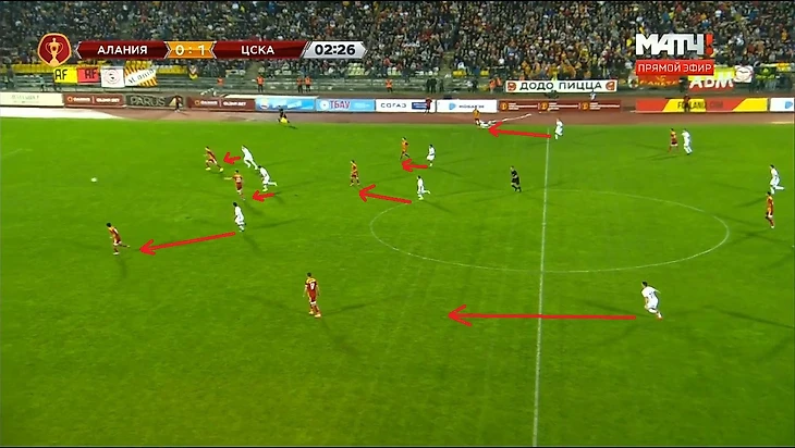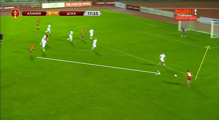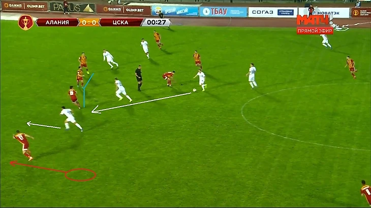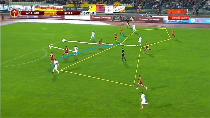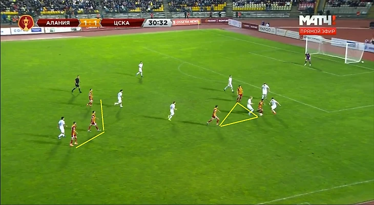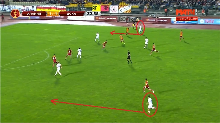 Тренерский штаб "Алании" реагирует на эти изменения, выпуская Кокоева в центр полузащиты, вместо защитника Шавлохова, перестраиваясь тем самым в схему 4-3-3. Но, к сожалению, минутой ранее Чалов-Нисимура-Обляков уже разыграли комбинацию, в очередной раз, используя проникающую передачу.