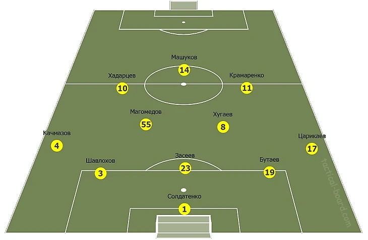 Футболисты ЦСКА использовали высокий прессинг, заставляя Солдатенко отправлять мяч далеко вперед. Бийол-Нисимура-Сигурдссон постоянно оказывали давление на тройку защитников Бутаев-Засеев-Шавлохов, тем самым, не позволяя разыгрывать мяч, и выйти в атаку за счет коротких передач через Магомедова или Хугаева, которых в свою очередь опекали Обляков и Ахметов.