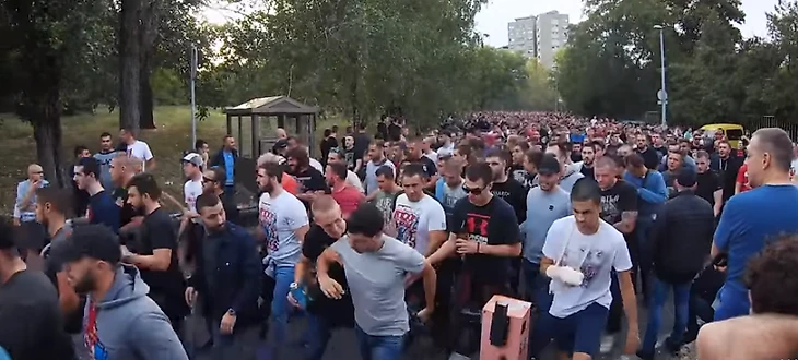Расстояние между стадионами клубов – всего 850 метров. Фанаты «Црвены» идут на арену «Партизана» большой организованной толпой и поют.
