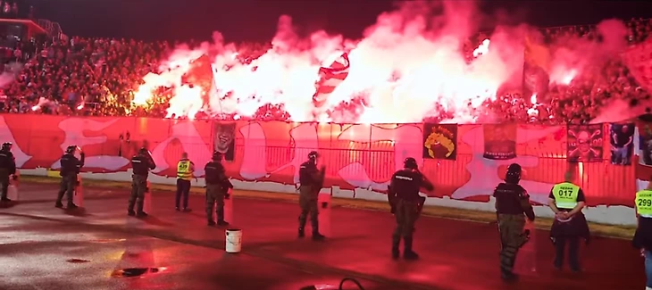 Во втором тайме болельщики «Црвены» устроили красное шоу. Это гостевой матч для них, но они чувствуют себя как дома.