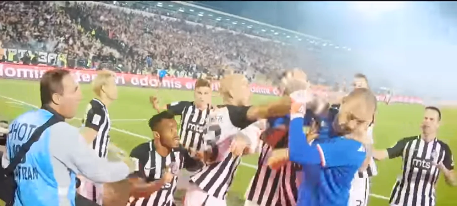«Партизан» открывает счет на 83-й минуте. К радующимся игрокам зачем-то подбегает вратарь «Црвены» – и начинается драка. Сербская классика.