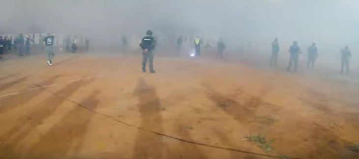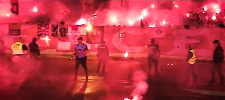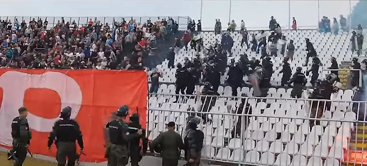 Первая драка с полицией начинается еще до начала матча – бушуют болельщики «Црвены», в ход идут файеры. Но полицейские быстро их успокаивают.