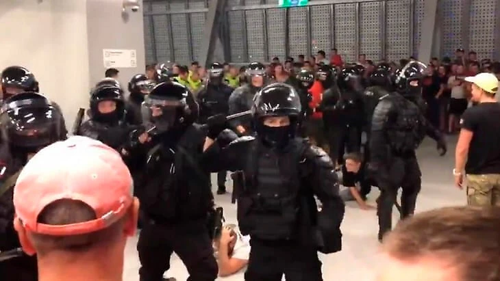 Между этими задержаниями ростовский ОМОН совершил вылазку в подтрибунку местного стадиона ЧМ. Самый безумный момент того вечера – нападение смельчака в каске и с дубинкой на молодого человека, который стоял к нему спиной и прикрывал собой девушку. Сериал продолжился в Петербурге – махачем болельщиков с отрядом Росгвардии. Там эталон бессмысленности – драка за места для курения и момент, когда фанат держал бойца за визор и бил в лицо (как выяснилось чуть позже: в том месте стадиона Росгвардии вообще быть не должно).