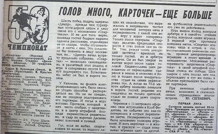 А вот «Спартак» немного забуксовал. Став лидером чемпионата с самого первого тура (и до последнего, что своеобразный рекорд), перед противостоянием с «Днепром» подопечные Бескова обыграли алма-атинский «Кайрат» дома – 2:1, затем на Центральном стадионе имени Владимира Ильича Ленина были биты ленинградским «Зенитом» - 1:3. Дальше пошли нули в Минске с местным «Динамо», и 2:5 от «Жальгириса» в Вильнюсе. Правда, дальше, вернувшись в Москву «Спартак» обыграл на Центральном стадионе «Динамо» ЦСКА – 2:0, и донецкий «Шахтер» - 3:0. В общем, команда Бескова приобрела уверенность после провального финиша первого круга. Но отнюдь не перед противостоянием с «Днепром». Да, на «Метеоре» выиграли «красно-белые» - 2:1. Но, то было весной, 7 апреля. А за прошедшие три месяца «Днепр» заиграл очень мощно. Причем, как на своем поле, так и на чужом. Что явно очень нервировало спартаковцев. Отсюда и ошибка молодого 22-летнего Альмира Каюмова на десятой минуте, когда спартаковский защитник решил обыграть такого же молодого, но уже опытного 23-летнего Олега Протасова. Нападающий сборной СССР отобрал мяч, и на виду у заворожено наблюдающих за его продвижением к воротам Рината Дасаева спартаковцев своего шанса не упустил – 1:0!
