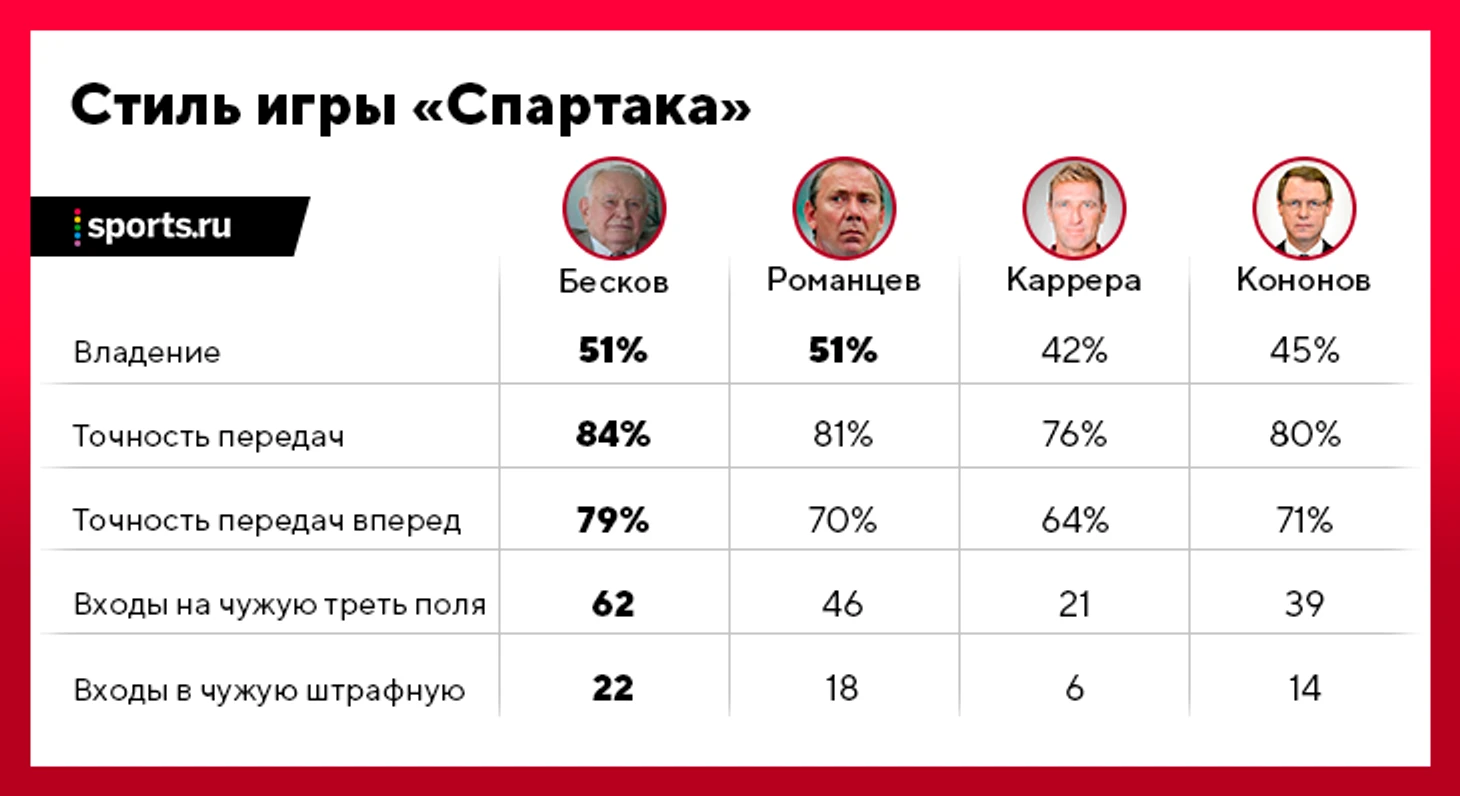 Это касается не только нынешней команды, но и времени Карреры. Никакого возрождения и близко не было. Параметры, характеризующие стиль, были далеки от эталонов, не только против мощнейшего «Ливерпуля», но и в удачном по результату матче с «Севильей» (5:1). У Массимо была харизма, везение и результаты, но никак не спартаковский стиль. Но без него едва ли стало лучше – Кононов выигрывает у итальянца в нашем сравнении, но лишь потому что так и не сыграл против топового европейского соперника. Относительно команды Бескова и стиль Карреры, и стиль Кононова выглядят убогими.