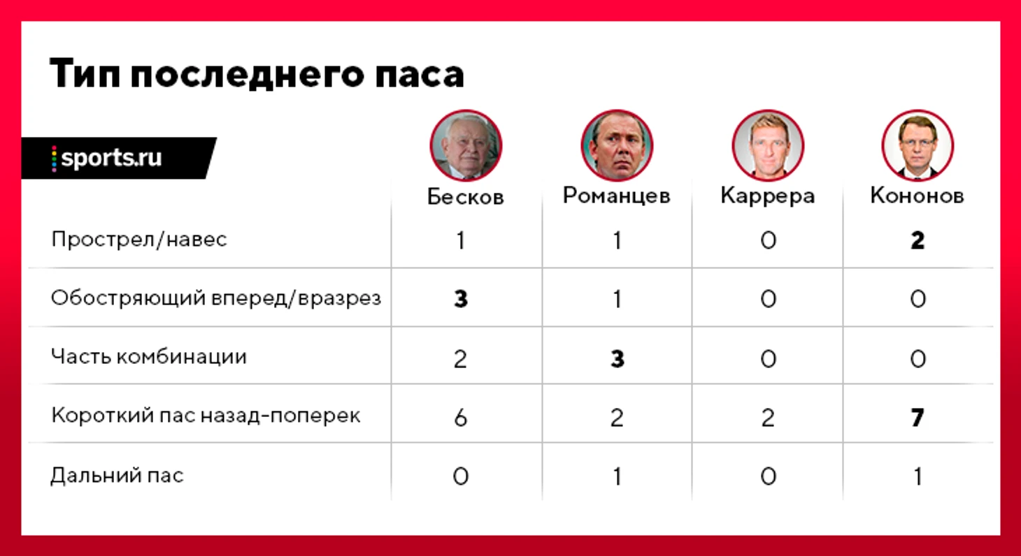 У Карреры была хотя бы неудачная попытка вести игру через лучшего пасующего игрока. У «Спартака» Кононова такого игрока нет, а направлением атак управлял соперник (не самый грозный соперник на фоне остальных). Любые идеи команды сводились лишь к контратакам.