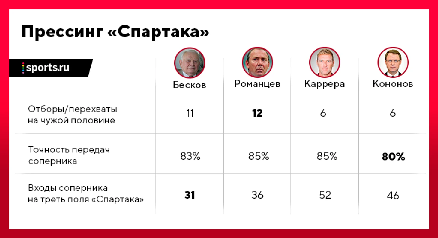 Некоторые аспекты просто на космическом уровне. Например, 62 входа на чужую треть при Бескове. Для контекста в чемпионский сезон Карреры было лишь 3 матча с 60 и более входами на чужую треть («Анжи», «Томь» и «Локомотив»). Средний результат по сезону – 46. При Кононове в этом сезоне был только один матч с 60+ («Тамбов»). Средний результат по сезону – тоже 46.