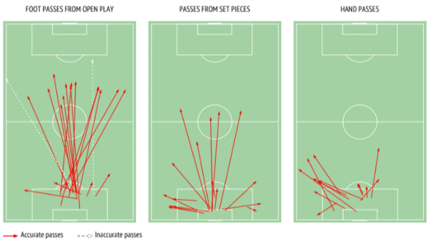 «Спартак» часто вынуждал делать такой пас. Вот карта передач вратаря «Нанта» Жан-Поля Бертран-Демана (очень много дальних):