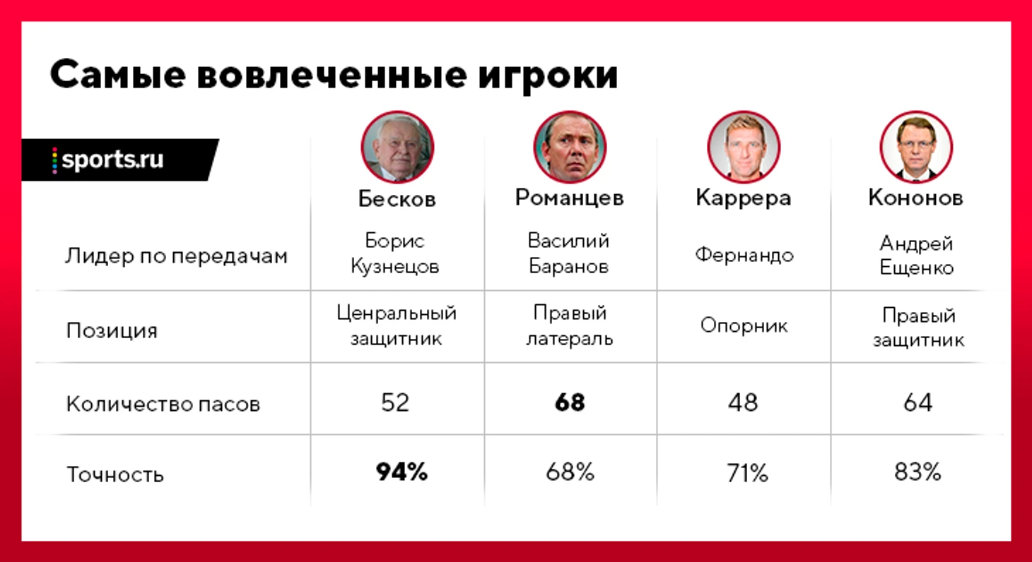 У Романцева самый вовлеченный в игру Василий Баранов, который в этом матче играл на правом фланге в схеме 3-5-2. Не лучшая позиция для футболиста, который ведет игру, но опять-таки важно, что нет перекоса. Илья Цымбаларь отстал всего на 1 пас. Титов (59 передач) и Тихонов (58 передач) тоже предельно вовлечены в игру. Вполне сбалансированная игра атакующей команды.