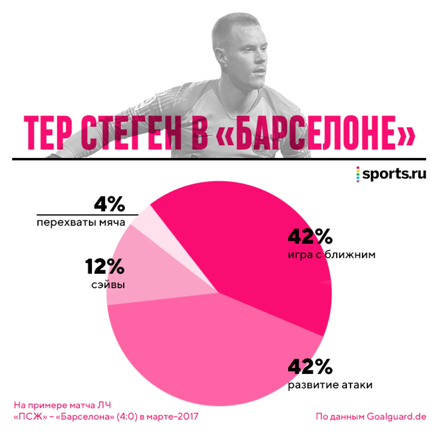 Суммарная доля участия тер Стегена в оборонительных мероприятиях – всего 16%, в то время как перепасовкой с партнерами и развитием атаки он занят 84% игрового времени. Он никогда не теряет концентрацию, особенно в моменты, когда мяч подолгу не появляется в его штрафной. Во время агрессивного прессинга со стороны противника тер Стеген, в отличие от Нойера, не отправляет мяч далеко вперед в борьбу, а сохраняет владение, пасуя ближнему. Это одна из его обязанностей – создавать численное преимущество на участках вблизи своей штрафной (3-в-2, 4-в-3), благодаря этому «Барселона» успокаивает игру и выходит из-под давления.