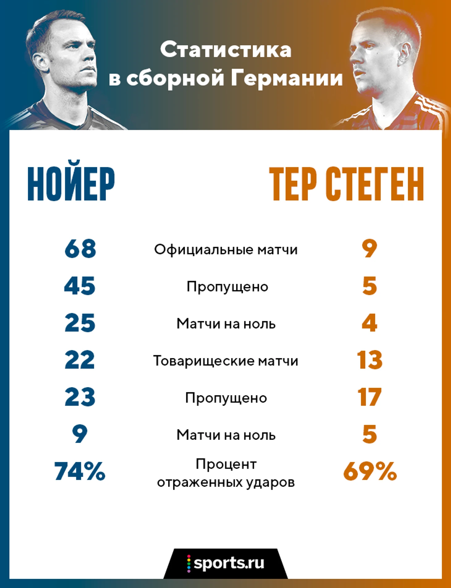 Нойер и тер Стеген похожи и в том, как они работают в ближнем бою. Типичная для всех немецких вратарей гандбольная техника, когда вратарь в широком шпагате бросается на нападающего. Правда, Нойеру чуть проще бороться за верховые мячи, так как он выше и тяжелее.