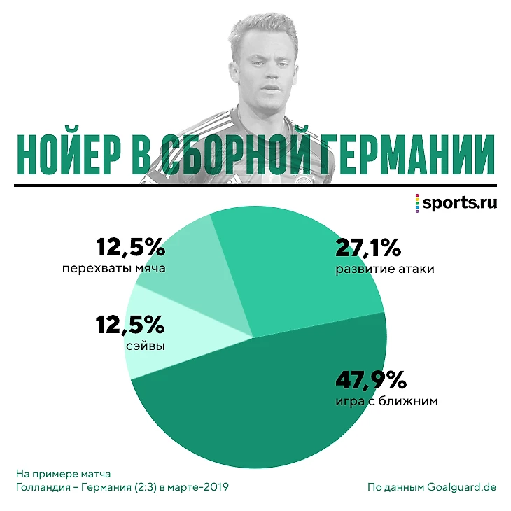 Нойер – и в мартовском матче против голландцев это было особенно заметно – в последнее время плохо работает под прессингом. В той игре он 7 раз оказывался в случае, когда нужно быстро расстаться с мячом, и 5 его передач в итоге ушли сопернику.
