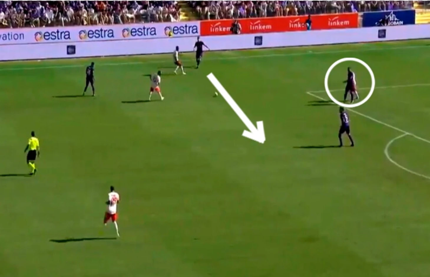 Тем не менее, высокий прессинг в игре «Ювентуса» всё же присутствует. В матче с «Фиорентиной» он наблюдался не раз, хотя и не был эффективен во многом из-за игры Роналду. На скрине видно, что Криштиану пешком следует за Пеццелой, хотя спокойно мог сделать 2 шага и перекрыть возможность передачи на Баделя, не дав развиться атаке хозяев.
