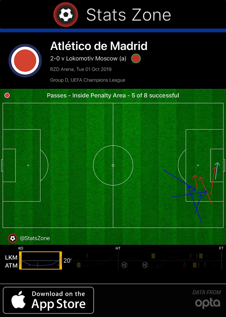 Понятно, что «Атлетико» достаточно быстро после перерыва забил 2 гола (плюс в концовке Феликс на несколько минут стал вторым нападающим), но во втором тайме с игры «Локо» не прилетело ни одной передачи под удар после атак правым флангом.