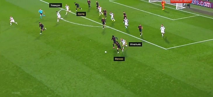Испанцы много владели мячом (69%) и атаковали через правый фланг – то есть «Локомотив» получил сценарий игры с «Зенитом». Жоау Феликс постоянно уходил с края в полуфланг, уводя за собой Рыбуса – в освободившуюся зону подключался Арьяс.