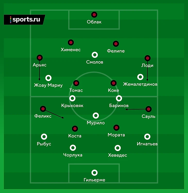 Главная неожиданность (кроме отсутствия Триппьера) – появление связки Мората-Диего Коста в атаке и смещение Жоау Феликса на правый фланг полузащиты. На этой позиции Феликс отыграл лишь несколько минут против «Хетафе» (первый тур), а Мората и Коста в этом сезоне вообще ни разу вместе не выходили в старте. Возможно, Симеоне просто хотел опробовать новый вариант в атаке, но скорее это был план под «Локомотив».