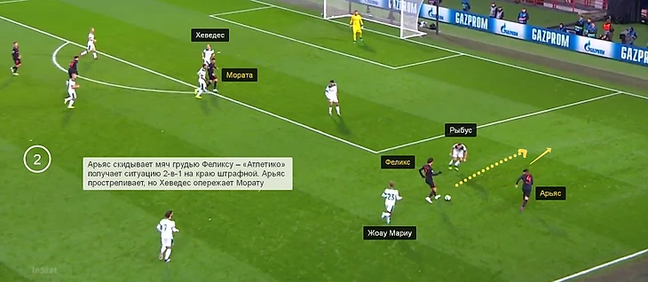 Такое давление на «Локо» во многом стало возможно именно из-за узкой позиции Феликса: при первой стадии позиционной атаки «Атлетико» Жоау Мариу не понимал, перекрывать ли ему направление передачи на Феликса (чаще выбирал этот вариант) или уходить шире за Арьясом. В результате Жоау Мариу и Рыбус вдвоем держали Феликса, а Арьяс свободно получал мяч.