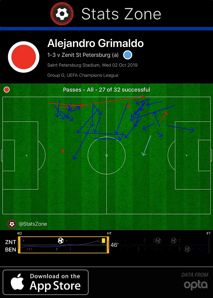 План не сработал – при большем владении в первом тайме (54%) лишь одно касание Таарабта привело к передаче вперед, а вообще «Бенфика» сделала только 7 передач в штрафной. Гримальдо тоже был неопасен – сразу после получения мяча к нему выдвигались Шатов или Смольников, из-за чего на половине «Зенита» Алекс отдал только две передачи вперед низом (и еще сделал два кросса – а всего за тайм «Бенфика» сделала шесть с игры, даже меньше хозяев).