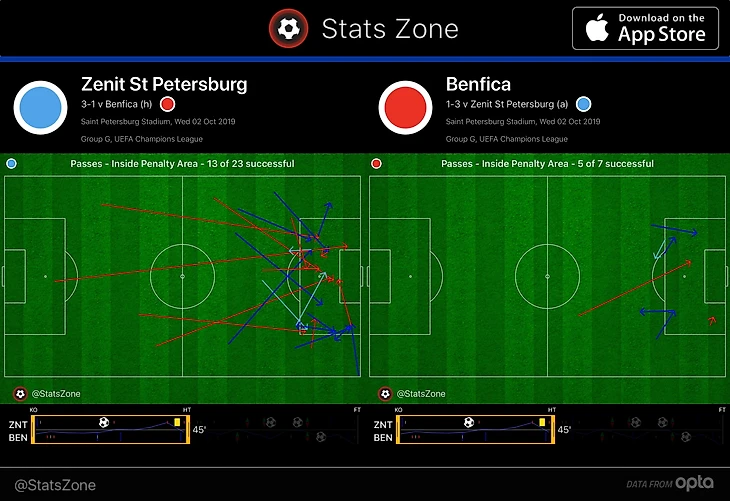 С таким стилем ключевыми игроками «Зенита» стали Дзюба и Оздоев. Артем очень часто встречался с мячом (чаще до перерыва это делали только Ракицкий и Оздоев) и вступал в верховые единоборства (5 выигранных из 5), а Магомед снова был прекрасен в прессинге – с него пришли все три атаки «Зенита» с ударами после отборов в центре и на половине «Бенфики» (в том числе – голевая).