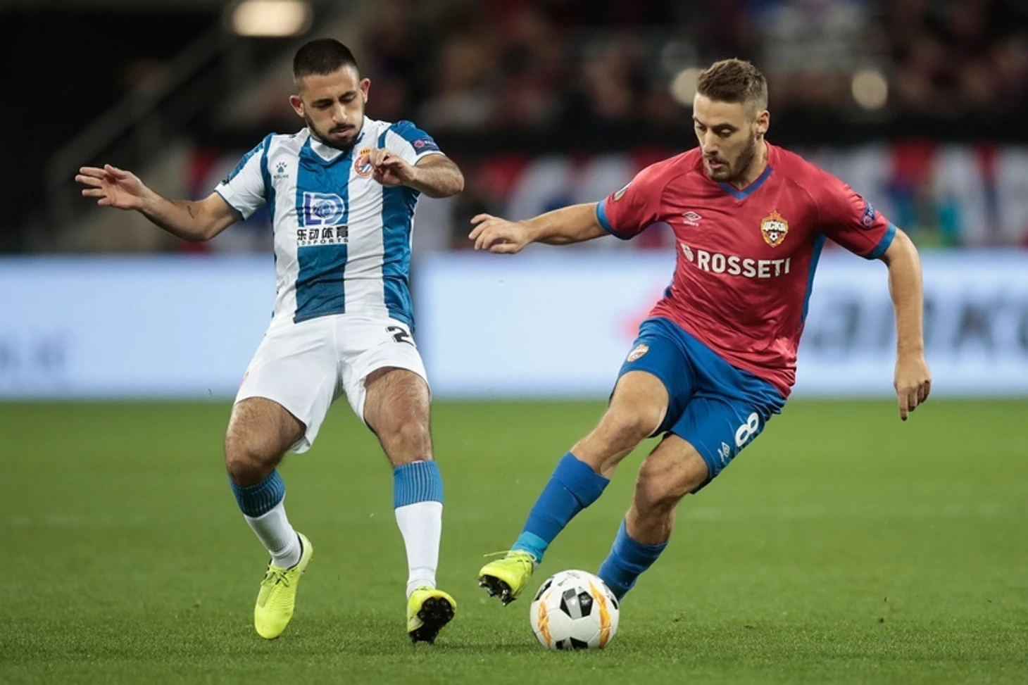 Первые 15 минут матча «армейцы» устроили штурм на половине поля соперника, чаще всего активные действия проявляли Влашич и Сигурдссон. К 20-й минуте игра перешла в центр поля, а на 22-й в испанской команде произошла вынужденная замена, Кампусано вышел на поле вместо Кальери. ЦСКА заметно больше владел мячом (60 / 40%), но опасных моментов не возникало. На 31-й минуте главный тренер тренер «Эспаньола» Давид Гальего получил «горчичник» за эмоциональное высказывание. Последняя треть первого тайма прошла под шквал атак российской команды, но поразить ворота соперника, увы, так и не удалось. Перерыв!