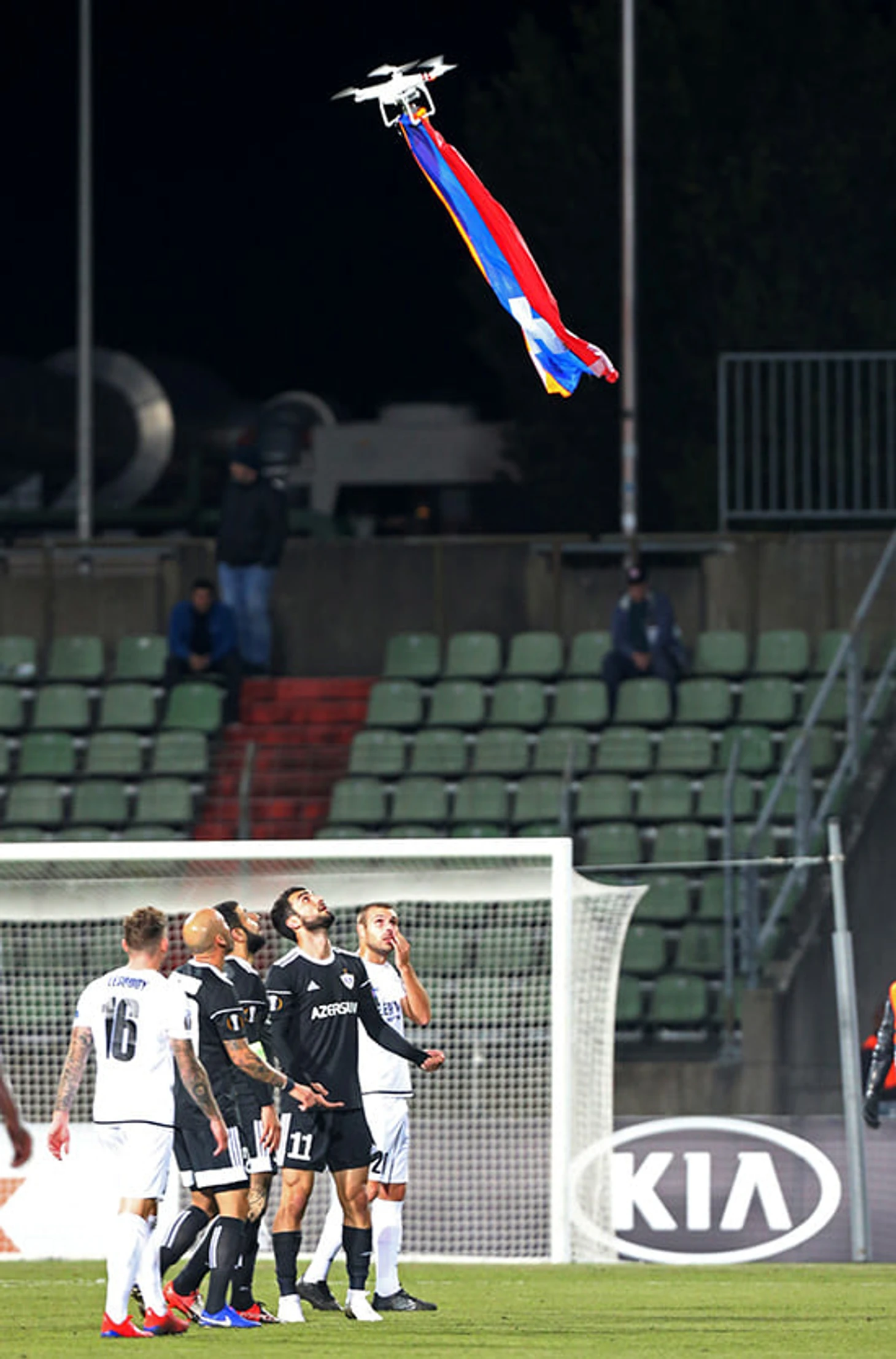 Футболисты "Карабаха" сперва попытались сбить флаг, но затем решили не отвечать на эту провокацию. В итоге, дрон вернули к себе запустившие его армяне, управлявшие им с крыши здания напротив стадиона.