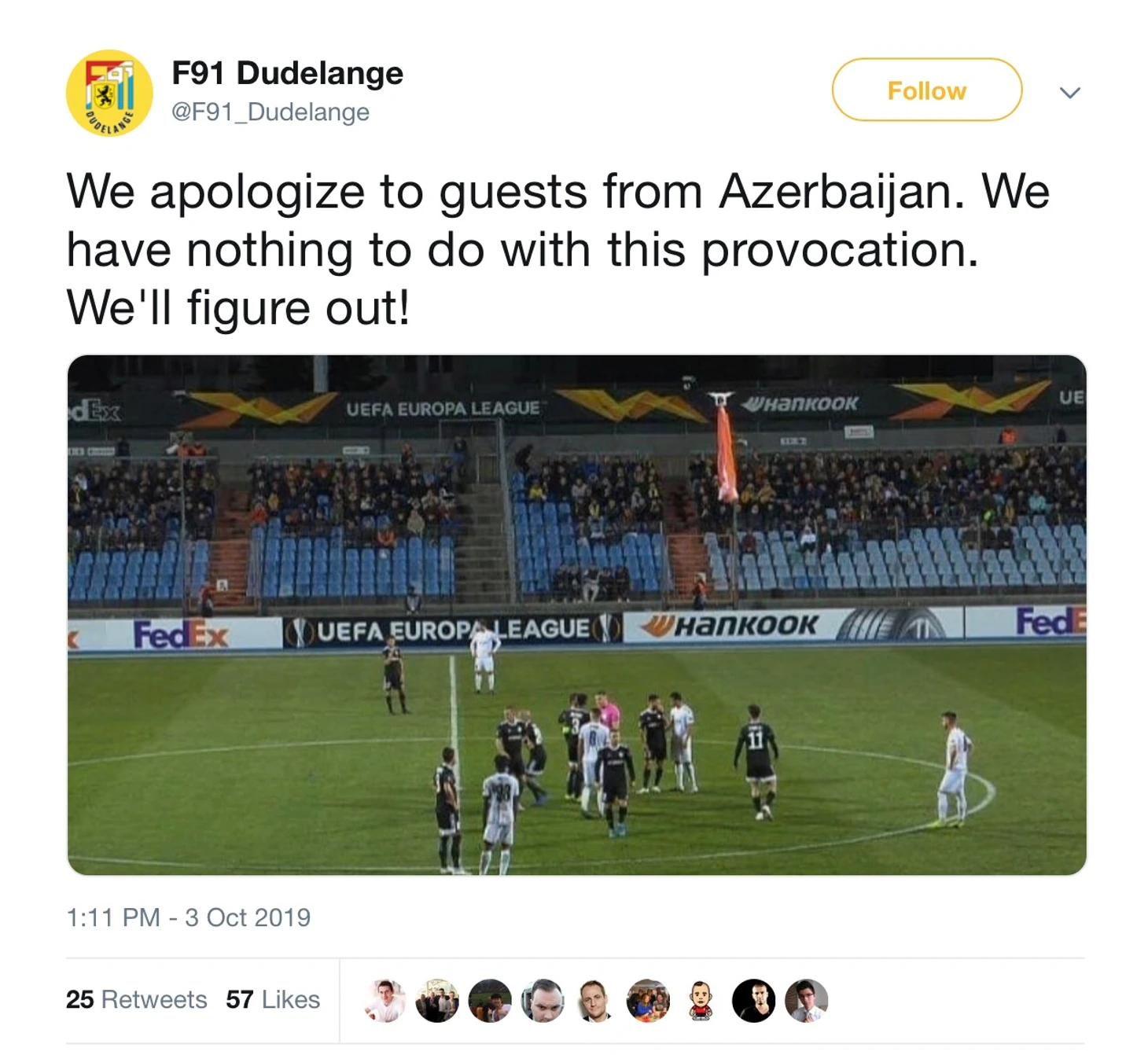 Министр спорта Люксембурга Дан Керш извинился перед руководством "Карабаха" за случившееся. Дан Керш заверил руководство клуба, что он и правительство Люксембурга сделают все для наказания провокаторов, запустивших дрон с флагом во врем матча. Керш также заявил, что Люксембург поддерживает территориальную целостность Азербайджана.