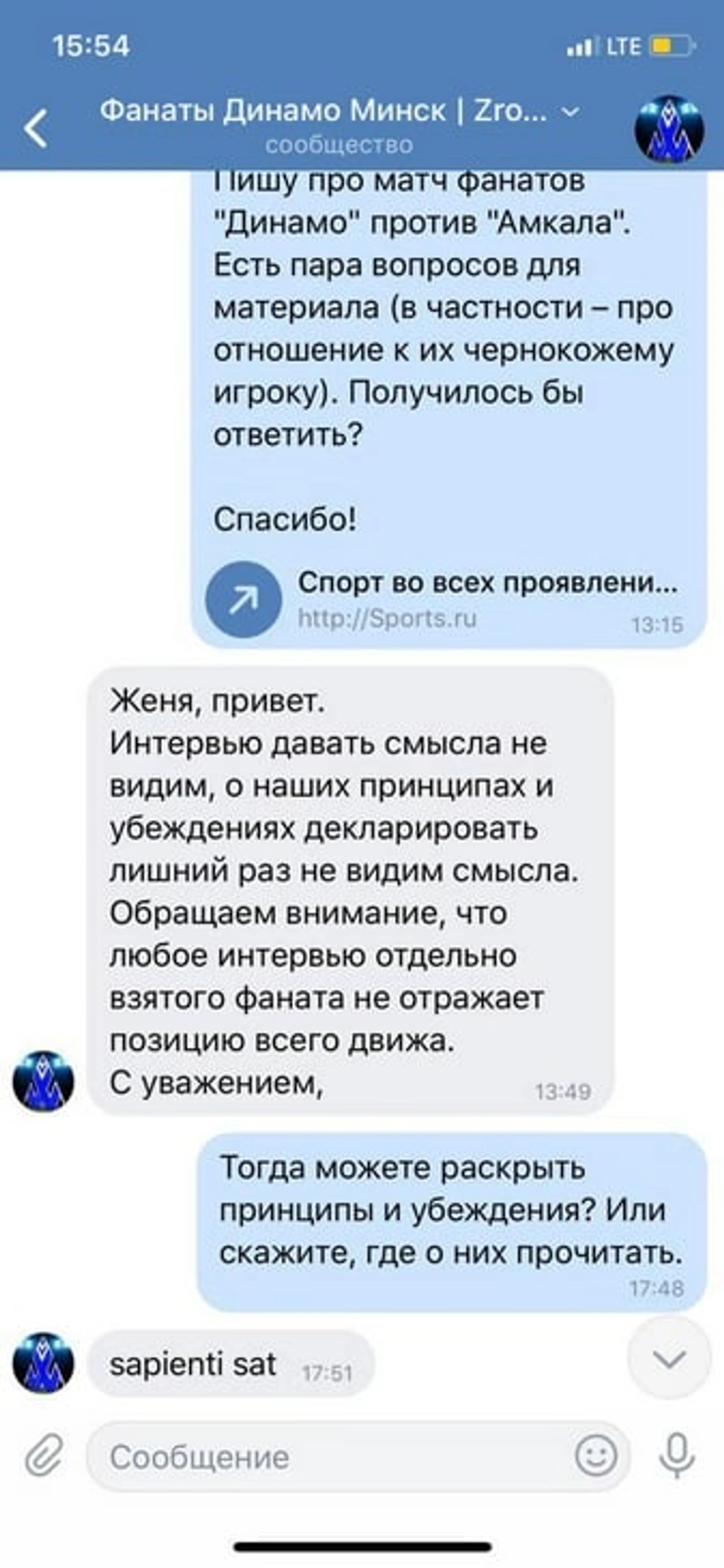 «Декларировать лишний раз наши принципы и убеждения смысла не видим», – ответила администрация главного сообщества фанатов минского «Динамо» в ВК, которая также отметила: «Любое интервью отдельно взятого фаната не отражает позицию всего движа».