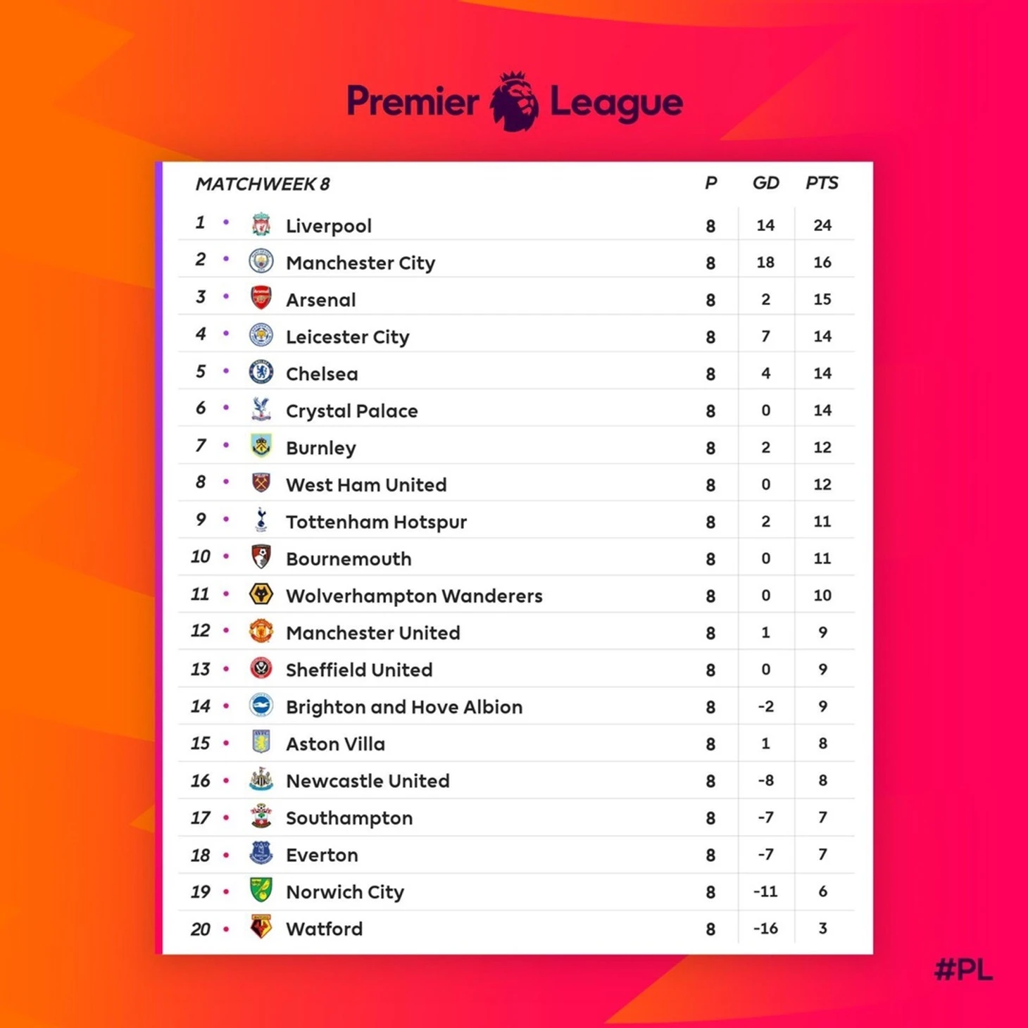 После 8 туров «Ливерпуль» не потерял ни одного балла и имеет восьмиочковое преимущество над ближайшим конкурентом. На старте чемпионата «Ливерпуль» успел встретиться с несколькими командами, которые претендуют на топ-4, но все равно очков не терял. Самые большие трудности подопечные Клоппа испытали, пожалуй, в гостевой встрече с «Шеффилд Юнайтед». Тогда лишь ошибка Хендерсона позволила гостям забить гол и заработать 3 очка. Еще можно выделить встречу с «Челси», который местами выглядел даже предпочтительнее и игру против «Лестера», которая закончилась победой «Ливерпуля» благодаря голу с пенальти. «Мерсисайдцы» семимильными шагами идут к успеху, но важно не терять концентрацию, все-таки несмотря на такой прекрасный старт есть некие шероховатости, которые могут помешать в будущем.