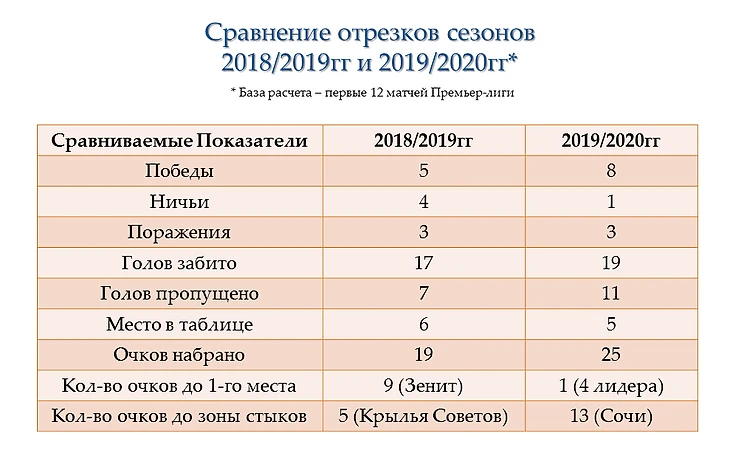 Наиболее точно прогресс команды может показать сравнение двух одинаковых отрезков прошлого и нынешнего сезона.