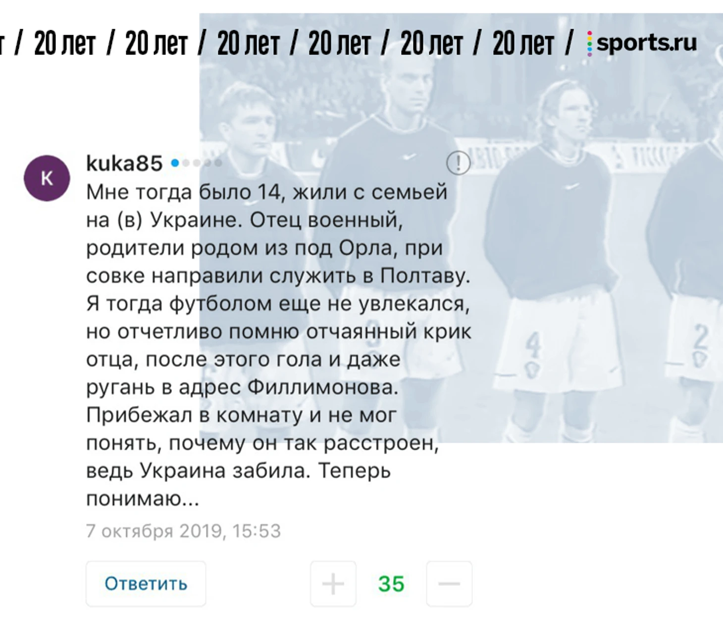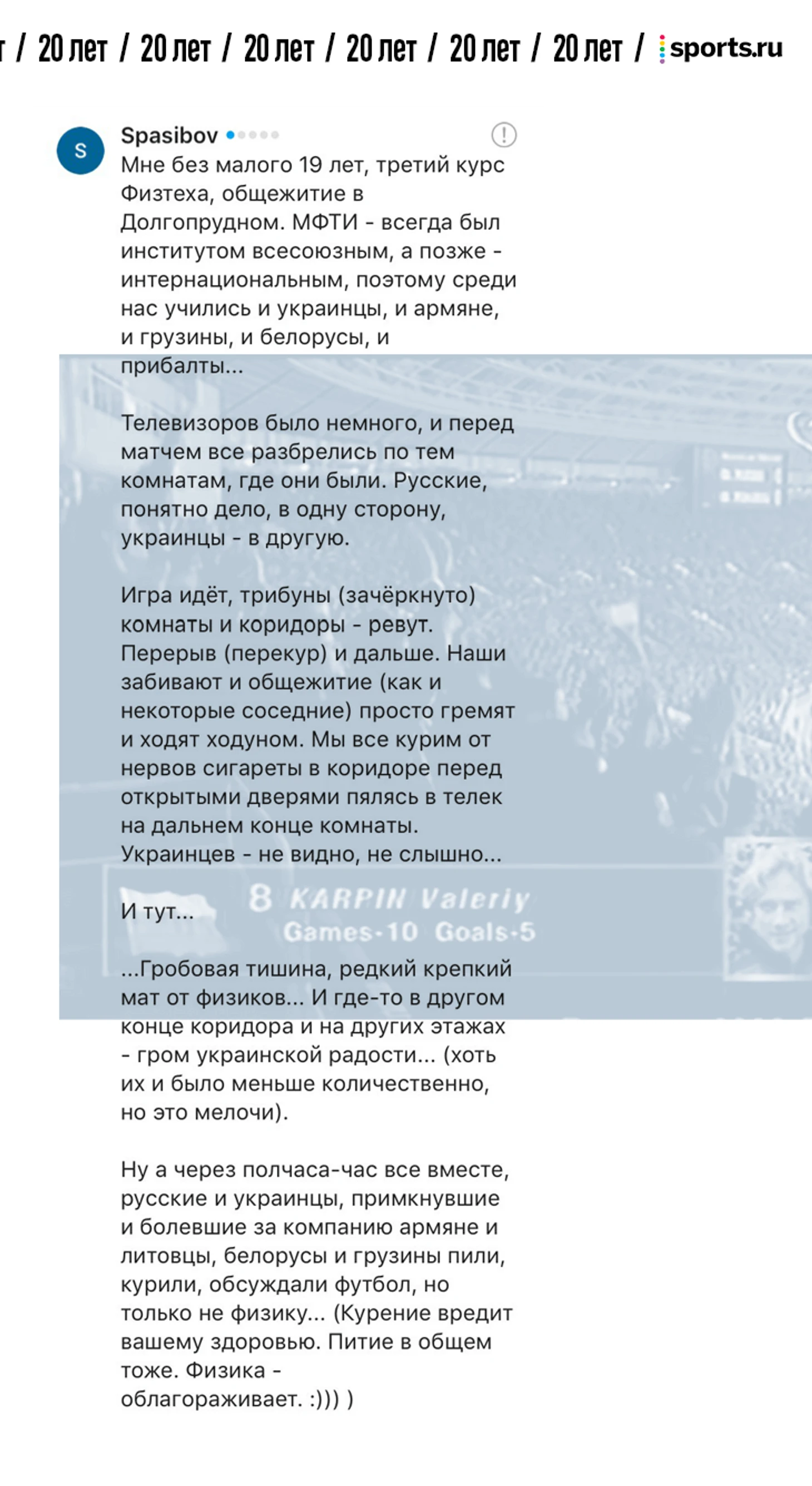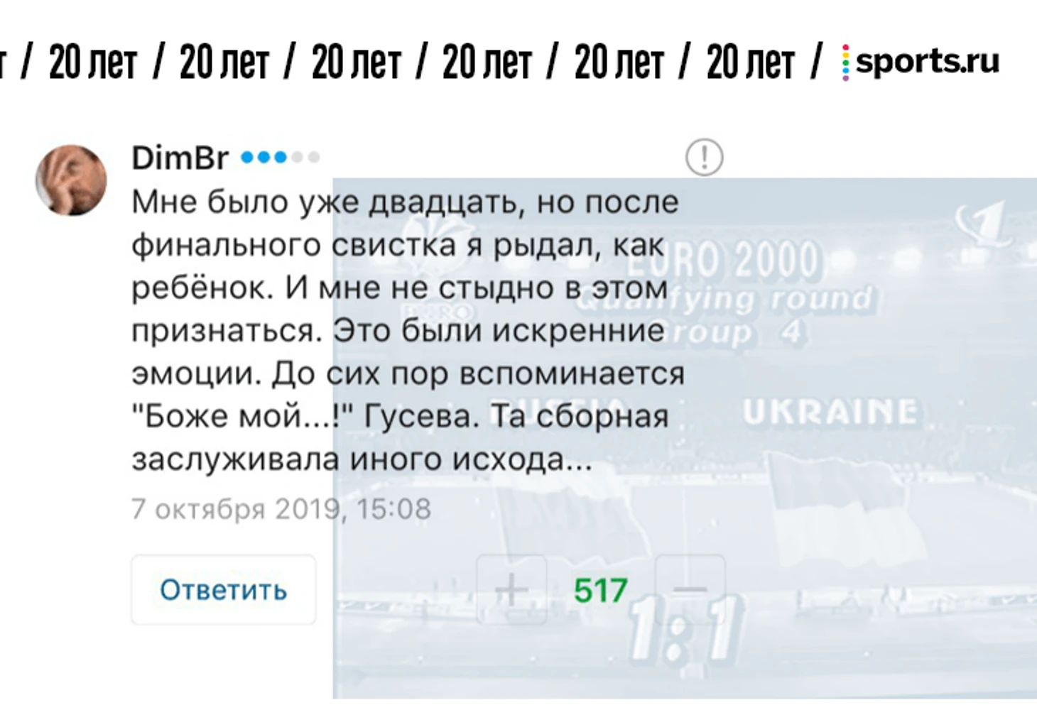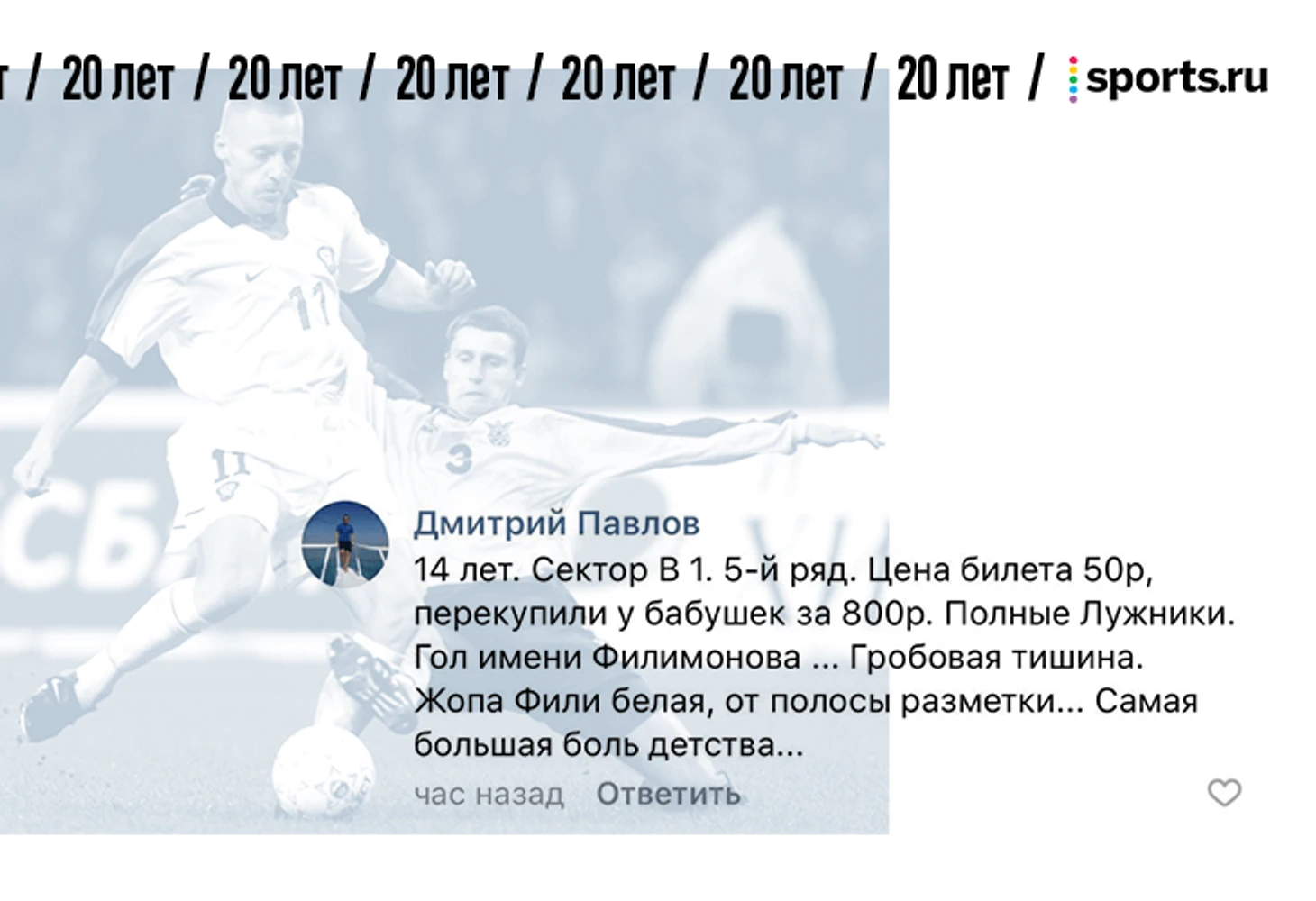 От редакции. В фотопосте про 20-летие матча России и Украины мы попросили вас поделиться самыми сильными воспоминаниями о том матче. Вы так и сделали – тот материал собрал 1357 комментариев. Мы выбрали лучшие, добавили ваши реплаи из соцсетей и оформили. Показываем.