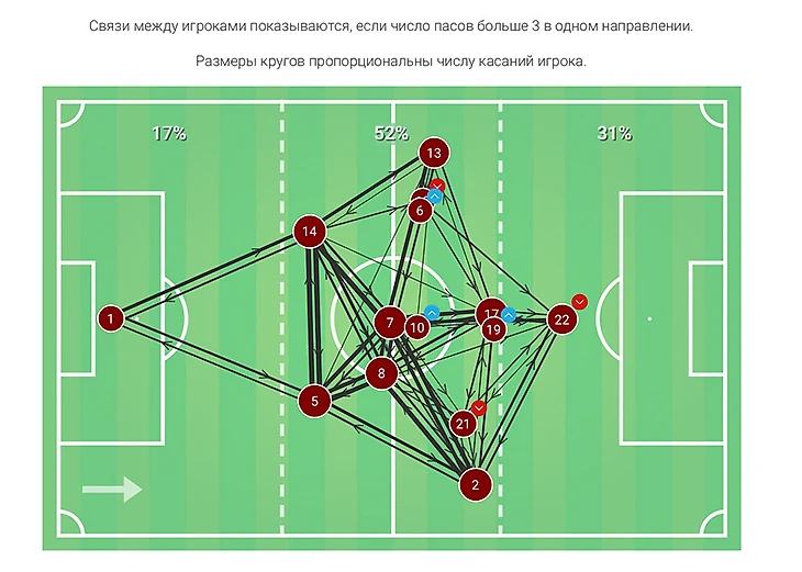А итоговое усреднённое расположение у Марио оказалось примерно на одной линии с Головиным. Количество связей между ним и другими футболистами тоже выглядят впечатляюще. Кудряшов, кстати, играл в такой же манере, тоже выполнил ряд опасных прострелов из открытых позиций, но дал чуть меньший объём.