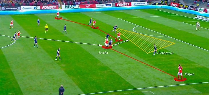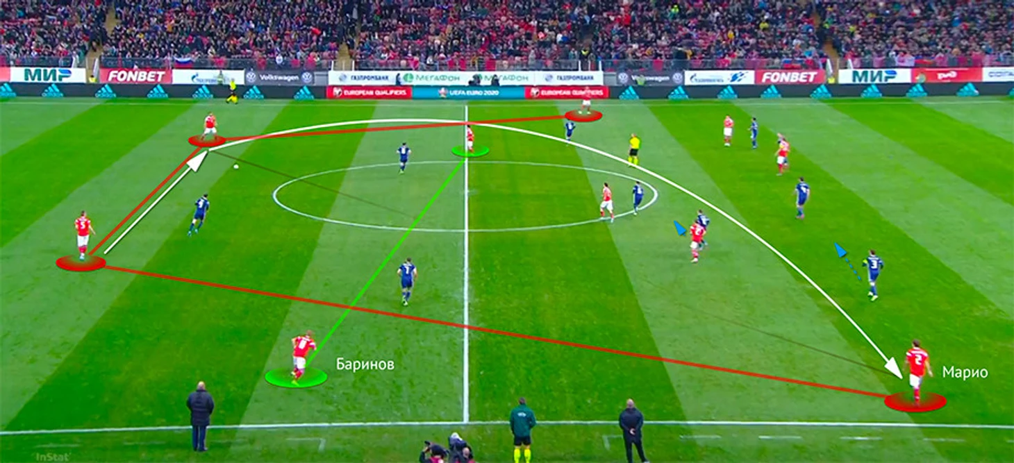 Тренерский штаб сборной России нашёл для Марио самую оптимальную роль. При розыгрыше мяча от центральных защитников он должен сразу же занимать широкую и высокую позицию, фактически на одной линии с нападающими. Фернандес не участвует в начальной стадии атаки, что логично, поскольку у него не самые выдающиеся диспетчерские данные (соответственно, зону во фланге занимает опорник – в данном случае Баринов), зато расположение Марио позволяет Ионову насытить центральную зону. Левый защитник Робертсон получает сразу две задачи: нужно одновременно сужать и контролировать Ионова, а также держать в уме диагональ в ширину на Марио. Левый полузащитник отвлечён Бариновым и в данной ситуации в линии не помощник.