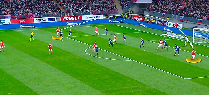 Если же левый защитник не будет реагировать на манёвры смещающегося Ионова и сосредоточится на положении Фернандеса, есть риск промежуточной позиции и дыры между защитниками, как на картинке снизу. Дзюба и Ионов разыграли короткую комбинацию, и в свободную зону можно было бы спокойно ворваться, если бы пас от Артёма последовал чуть сильнее.