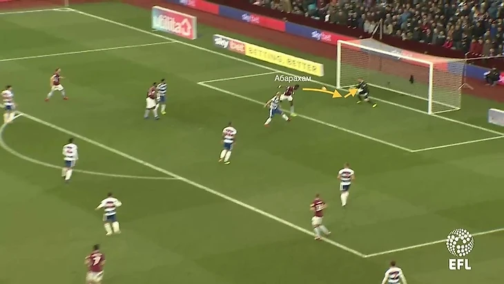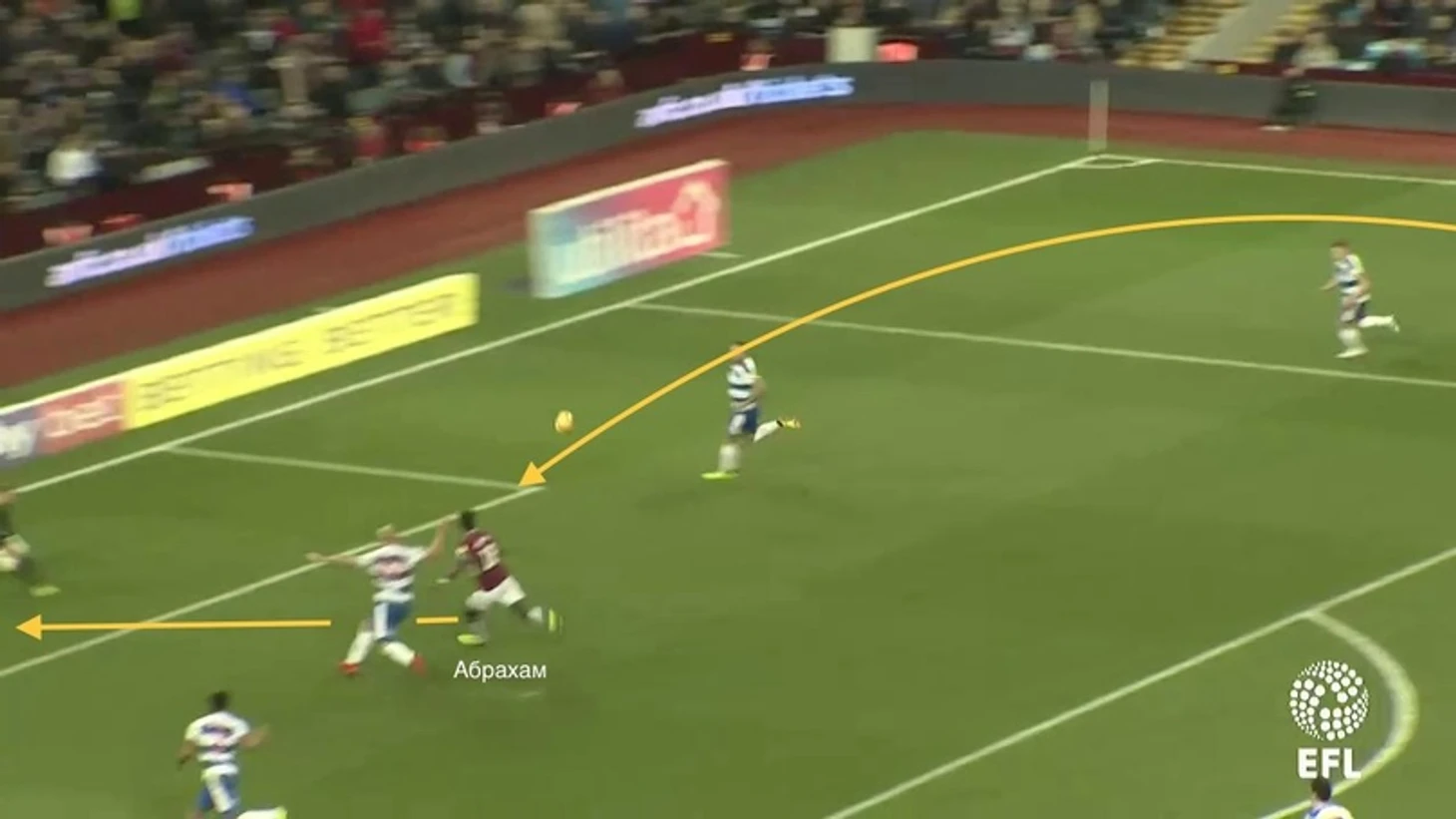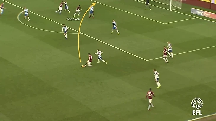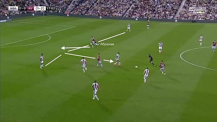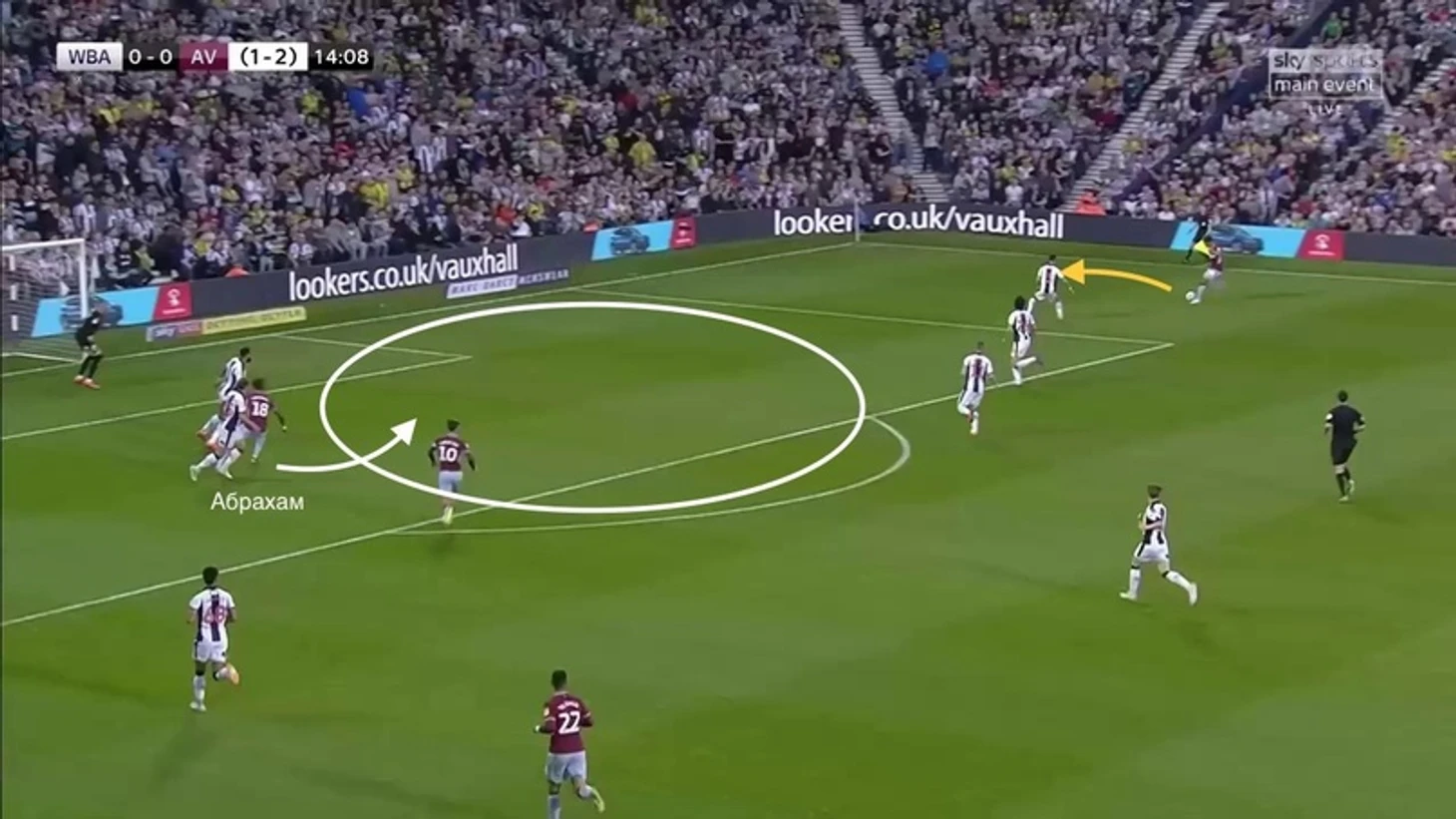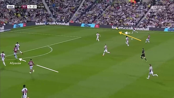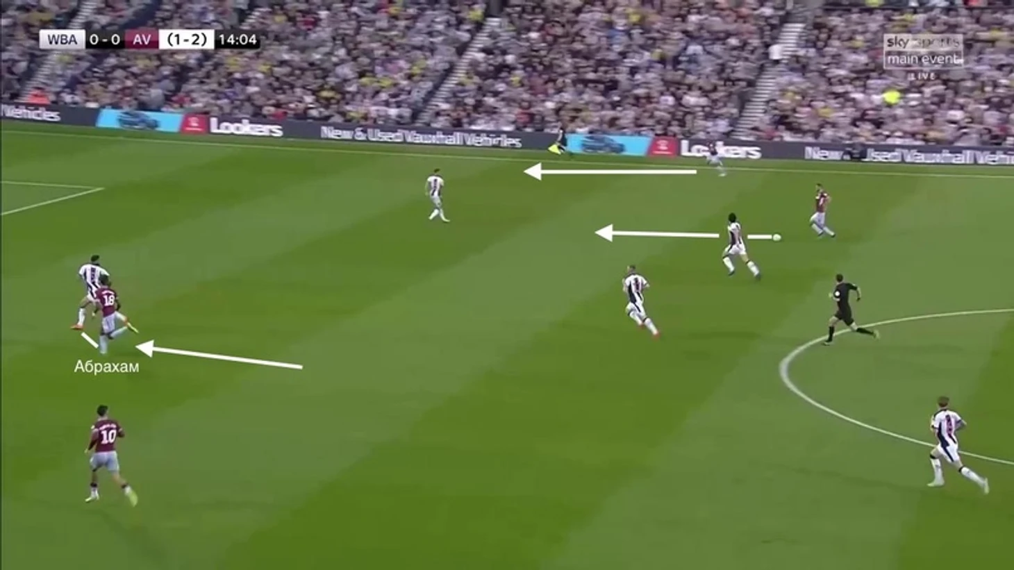 Пример — «Астон Вилла» в контратаке, Абрахам до последнего держится левее и стягивает защитников. Со стороны это выглядит странно, но на самом деле Тэмми просто создал себе пространство справа, чтобы добраться до мяча, но передача не прошла. А если бы прошла, Абрахам бы спокойно нанес удар по воротам.