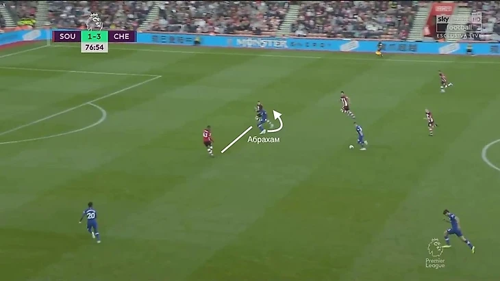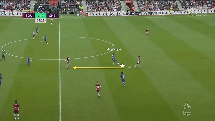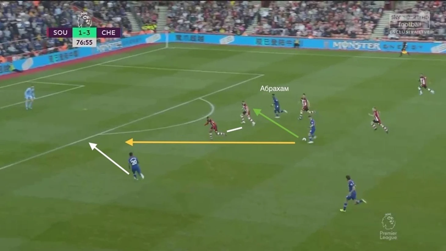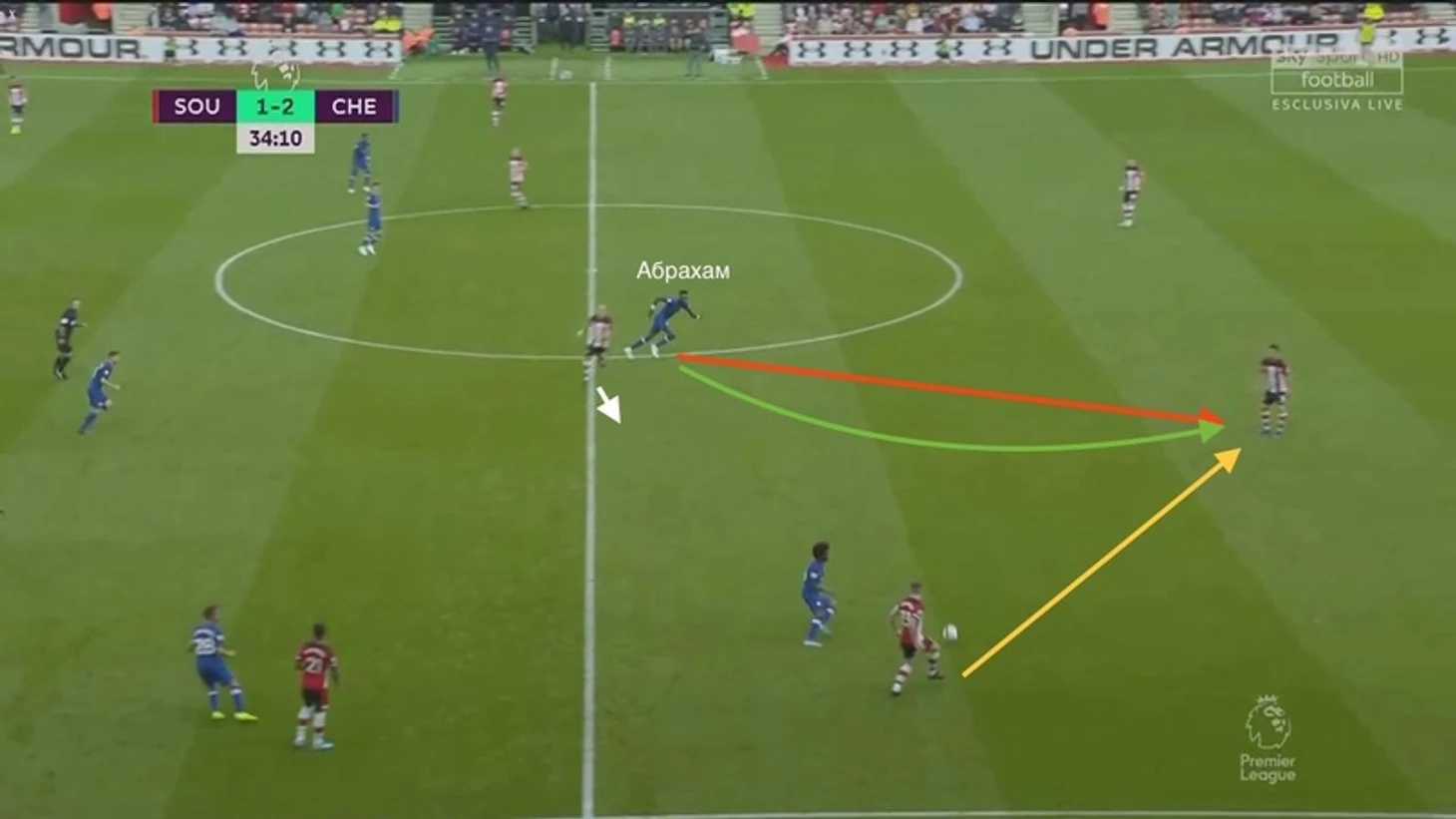 Эпизод из матча с «Саутгемптоном» — Абрахам реагирует на пас назад и выдвигается в прессинг, но не перекрывает направление передачи на освободившегося игрока. Да, соперник сделал шаг правее, но Тэмми должен был видеть это: