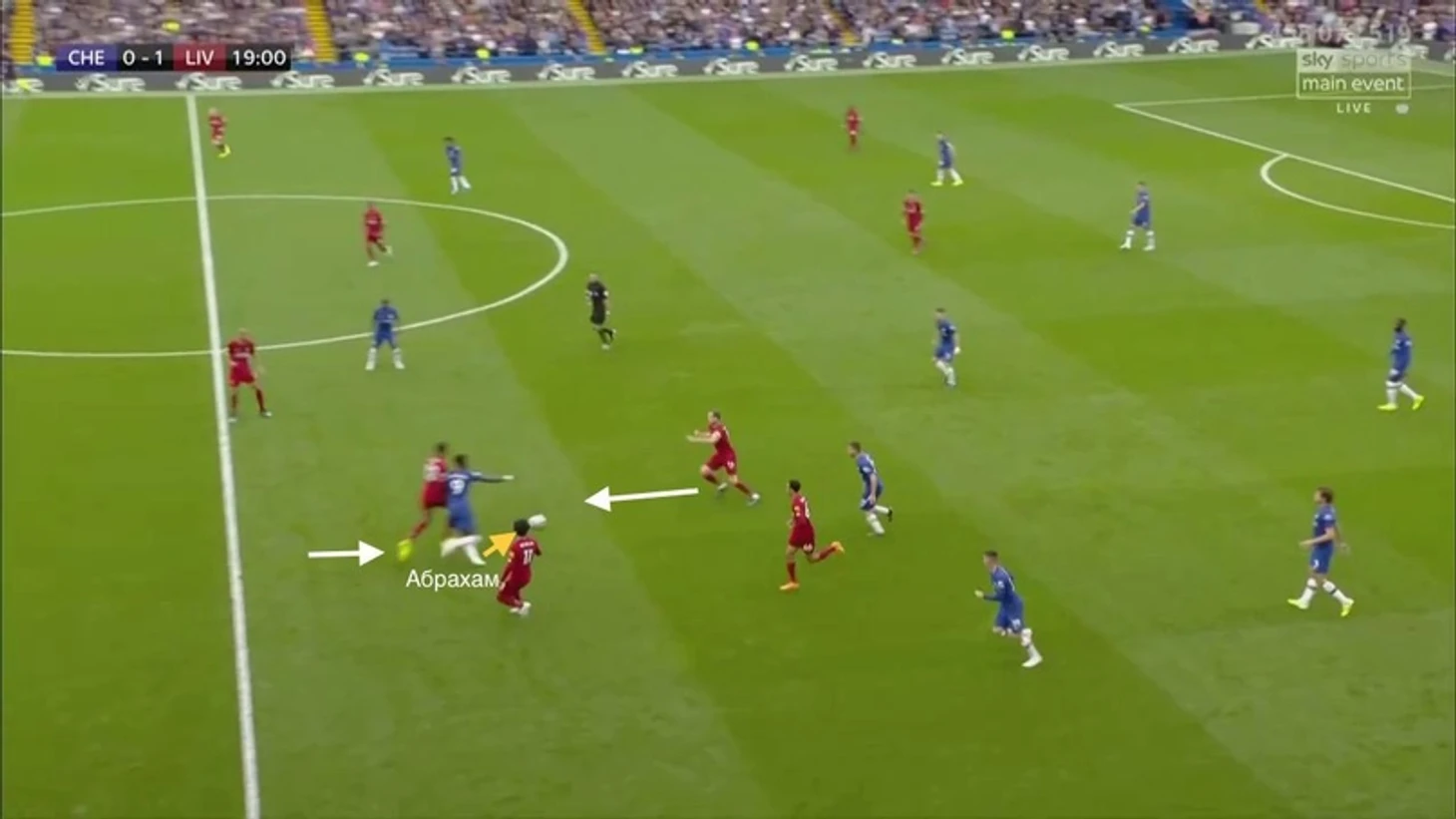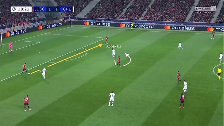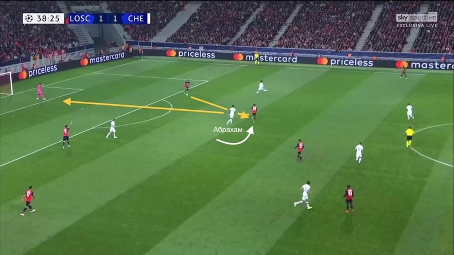 То же самое происходило и в матче с «Лиллем» — Абрахам играет со своим игроком пассивно, тот успевает освобождается, принимает передачу и отдает мяч вратарю. Так «Лилль» вышел из-под прессинга «Челси»: