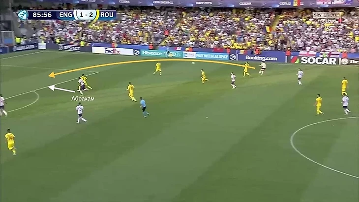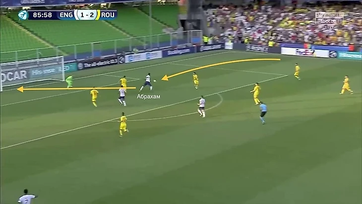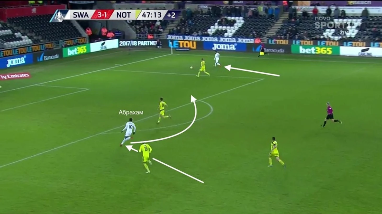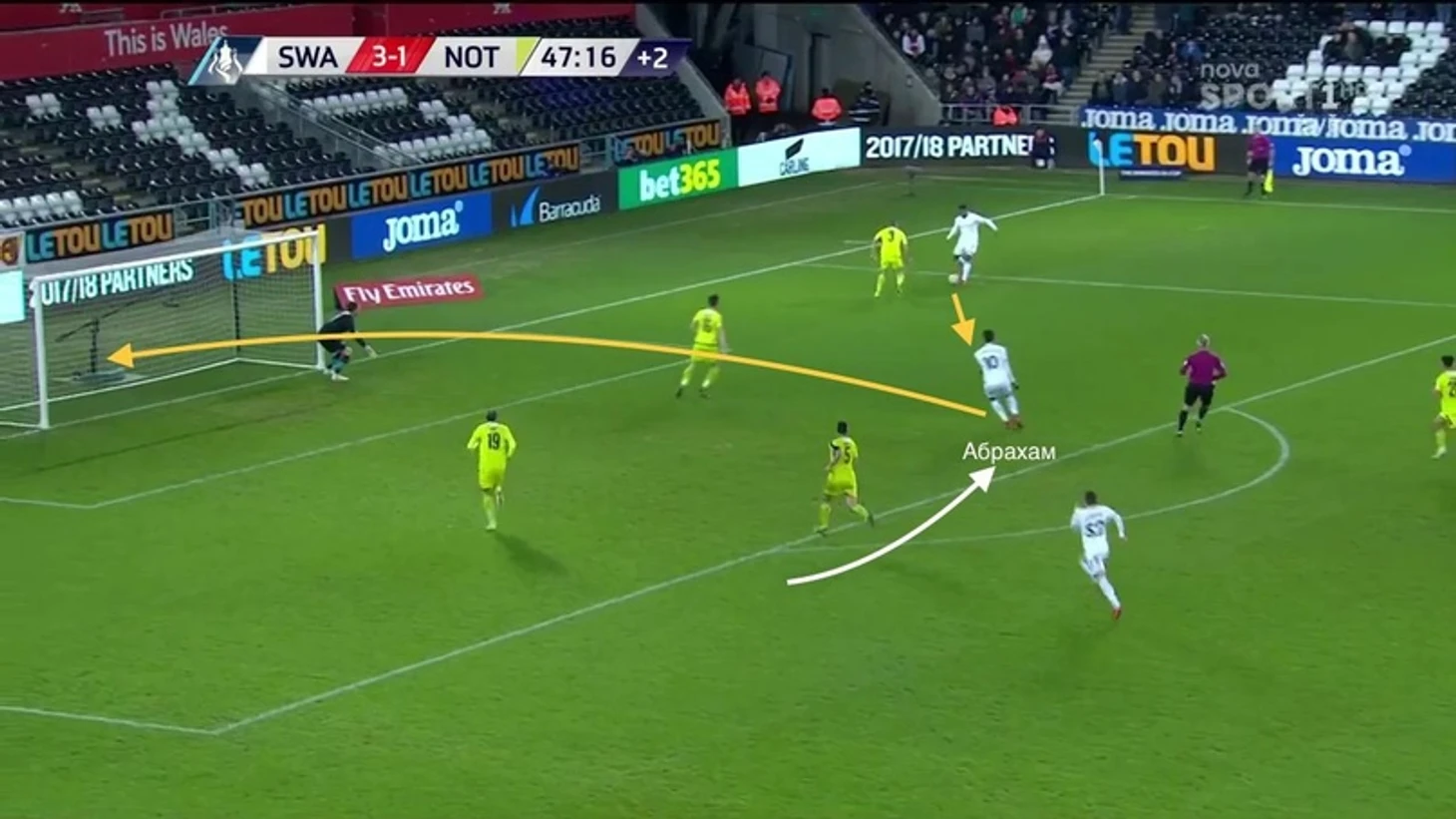 Поэтому Абрахам открывается чаще всего не в средней трети, а ближе к чужой штрафной, там, где его дистанционная скорость не станет серьезным недостатком (и таких ситуаций немало). Чем ближе к воротам, тем больше шансов на успех, тут все логично. Но, во-первых, Абрахам прекрасно чувствует линию офсайда и замечает ошибки защитников соперника, чем часто и пользуется, чтобы замаскировать свою низкую дистанционную скорость.