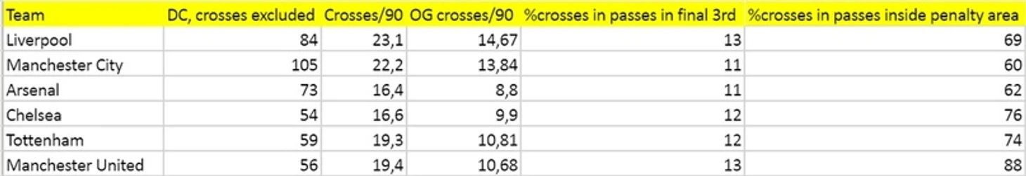 Важно, что под кроссами в данном случае подразумеваются не только навесы в штрафную (off the ground (OG) crosses), но и другие передачи с фланга - например, прострелы.