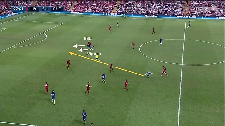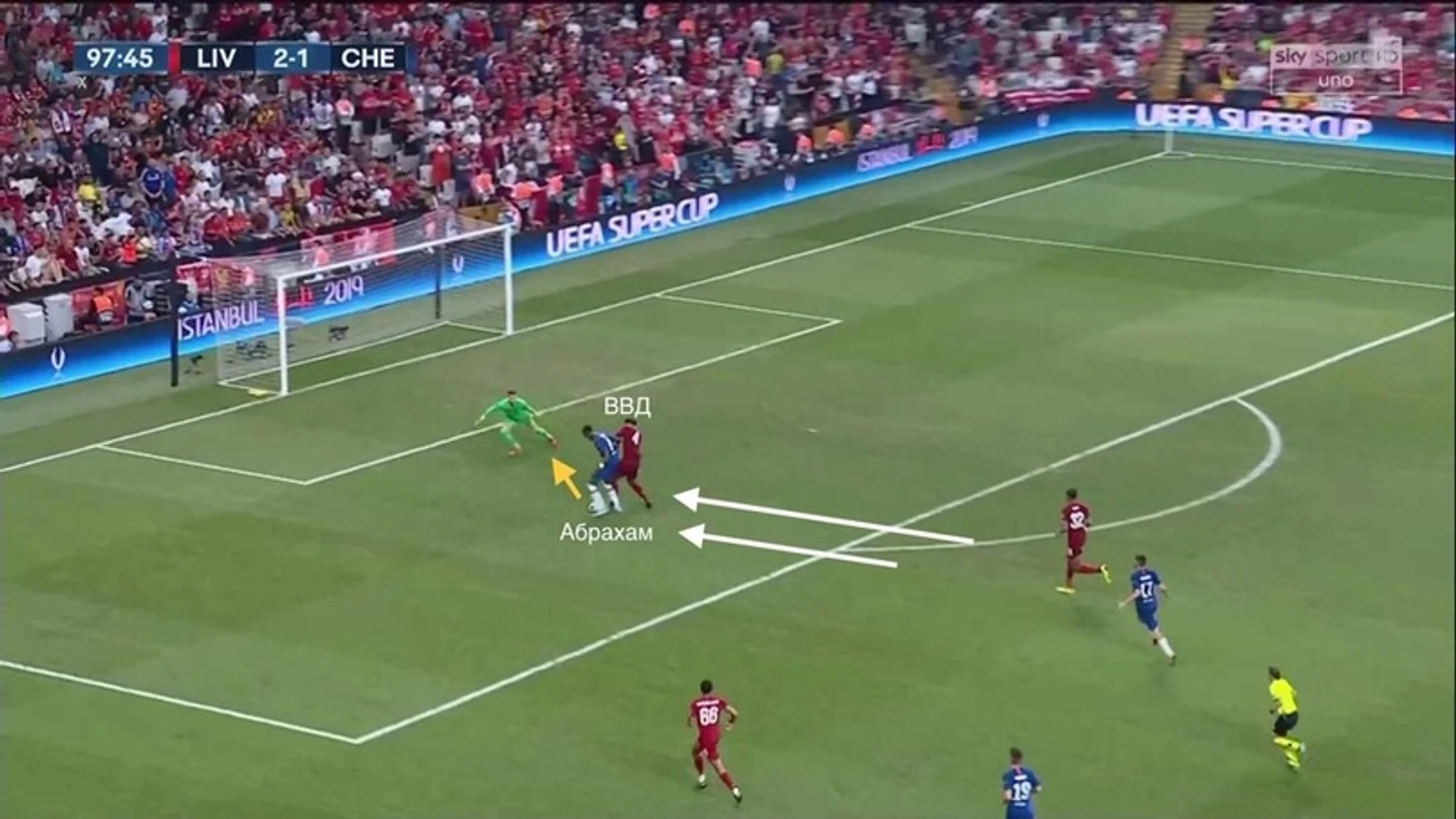 Однако проблема скорости никуда не уходит, и ее не всегда хватает для того, чтобы оторваться от защитника и завершить момент. Иногда эту проблему маскирует корпус, которым Абрахам укрывает мяч, но нормальный удар в таком положении нанести сложно. Эпизод из матча с «Ливерпулем» за Суперкубок УЕФА: