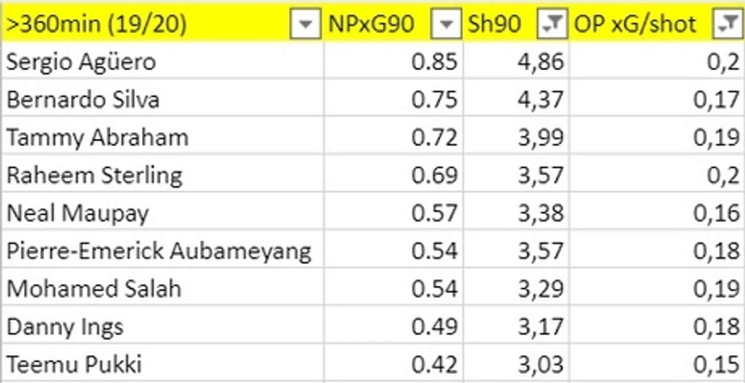 Скиллы Абрахама позволяют ему держать огненные темпы по набору xG и голов в начале сезона (даже несмотря на оверперформинг - 4,68 xG и 8 голов), он третий лучший в АПЛ по миксу - количество ударов за 90 минут (Sh90) + среднее качество этих ударов (OP xG/shot). Только монстры из «Сити» выглядят сильнее.