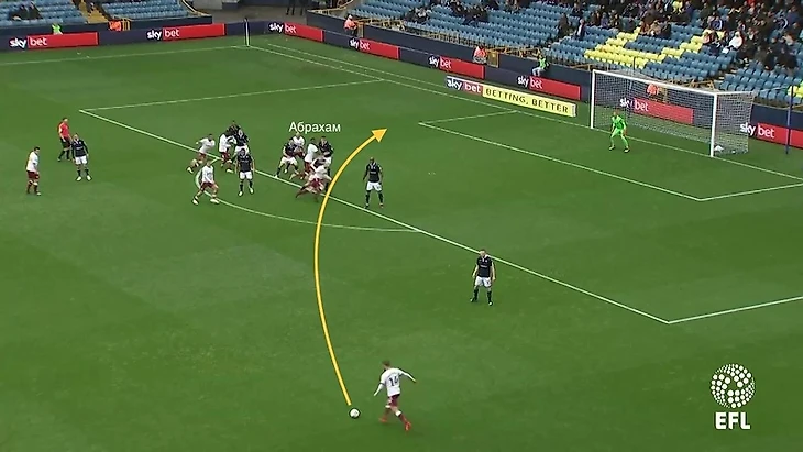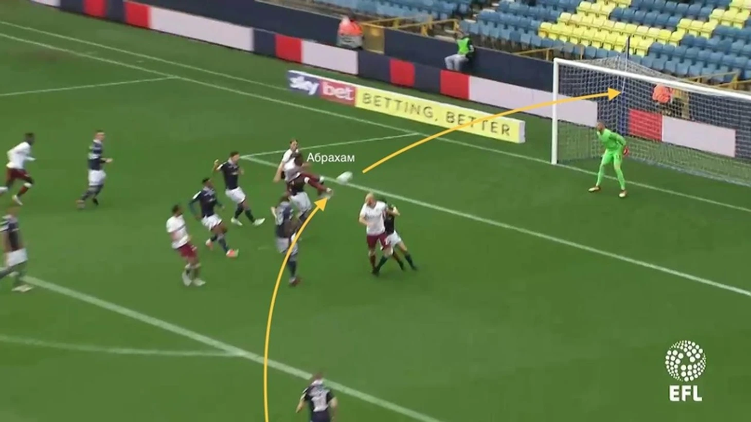 Кстати, Абрахам неплохо помогает себе руками и использует различные «грязные приемчики», но, кажется, в этом смысле он мог бы быть даже агрессивнее. В эпизоде с голом «Вулвз» видно, как Абрахам придерживает защитника, помогая себе первым оказаться на мяче. Есть и другая хорошая новость, отчасти нивелирующая недостатки Абрахама наверху. Умение Тэмми двигаться в штрафной позволяет Тэмми завершать навесы даже не головой. У него хватает пластичности для этого.