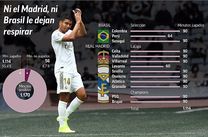 По информации Marca полузащитник "Реала" и сборной Бразилии Каземиро отыграл в сезоне 2019/2020 114 минут. Это 95,4% от возможного игрового времени. "Невостребованным" бразилец оставался всего 56 минут.