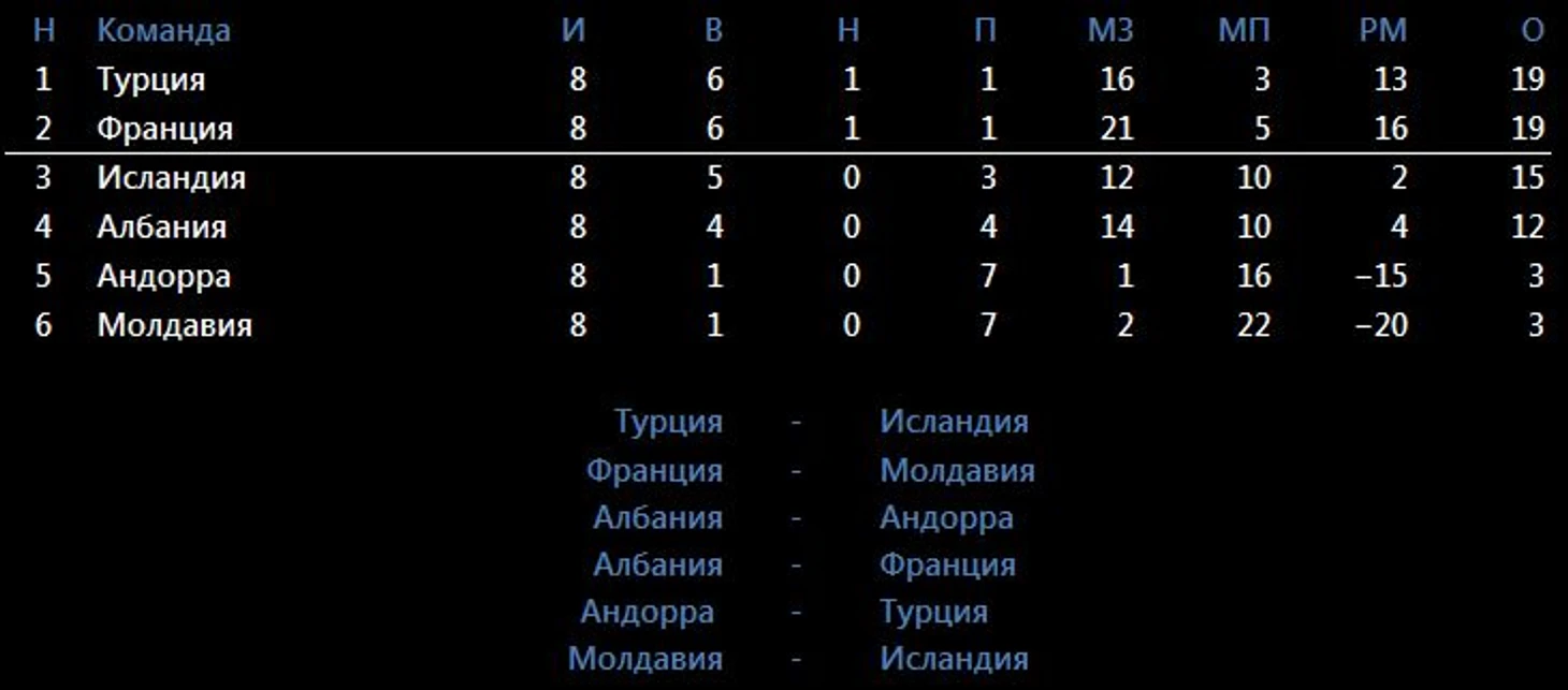 Франция гарантирует себе выход, еще в домашнем матче. Турция это сделает в последнем туре. Даже возможные две победы Исландии ничего не изменят. На мой взгляд Турция вполне может не выиграть домашний матч с Исландией, а вот Французы, скорее всего, осечек не допустят.