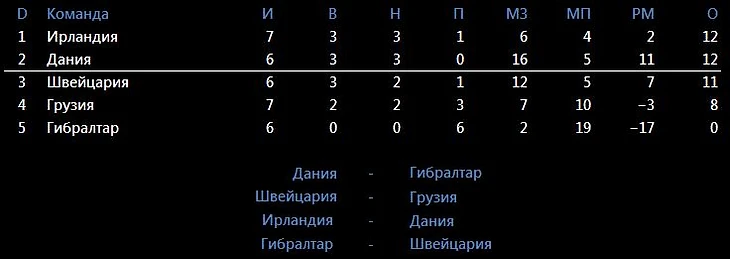 Довелось читать, что в этой группе похоронили Швейцарию и короновали Ирландию – бред. После побед Дании и Швейцарии Ирландцы в последнем туре окажутся в статусе догоняющих. Ирландия мало забивает и совсем не факт, что сможет это сделать по заказу в домашнем финальном матче с Данией. Тут скорее 0-0, или победа скандинавов. В параллельном матче, располагающаяся сейчас третьей Швейцария оформит себе выход на Евро.