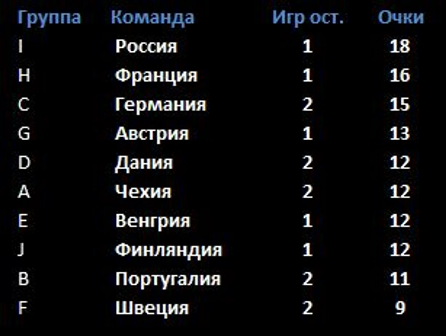 2. Если вдруг Дания не попадет на Евро, тогда России хорошо бы закрепиться во второй корзине. Для этого надо быть в лидерах по очкам среди вторых мест групп. На данный момент вторые места в группах набрали следующее количество очков (за вычетом очков против 6 мест своей группы).