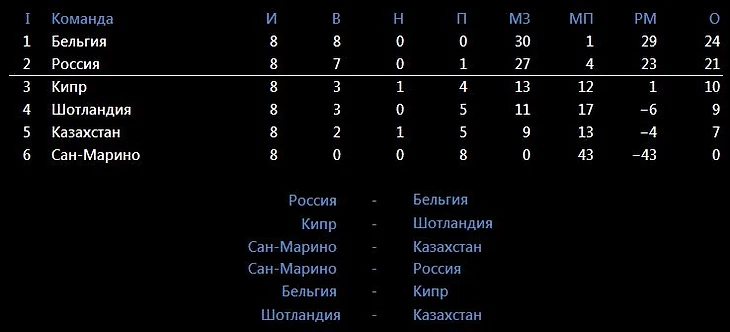 Всем известно, что для первого места России нужны сложные результаты. Победа 2-0 или 3-1 (при разгроме Сан-Марино) над Бельгией. Скорее всего этого не получится – соперник силен. Однако любые очки будут полезны для жеребьёвки Евро. Об этом ниже.